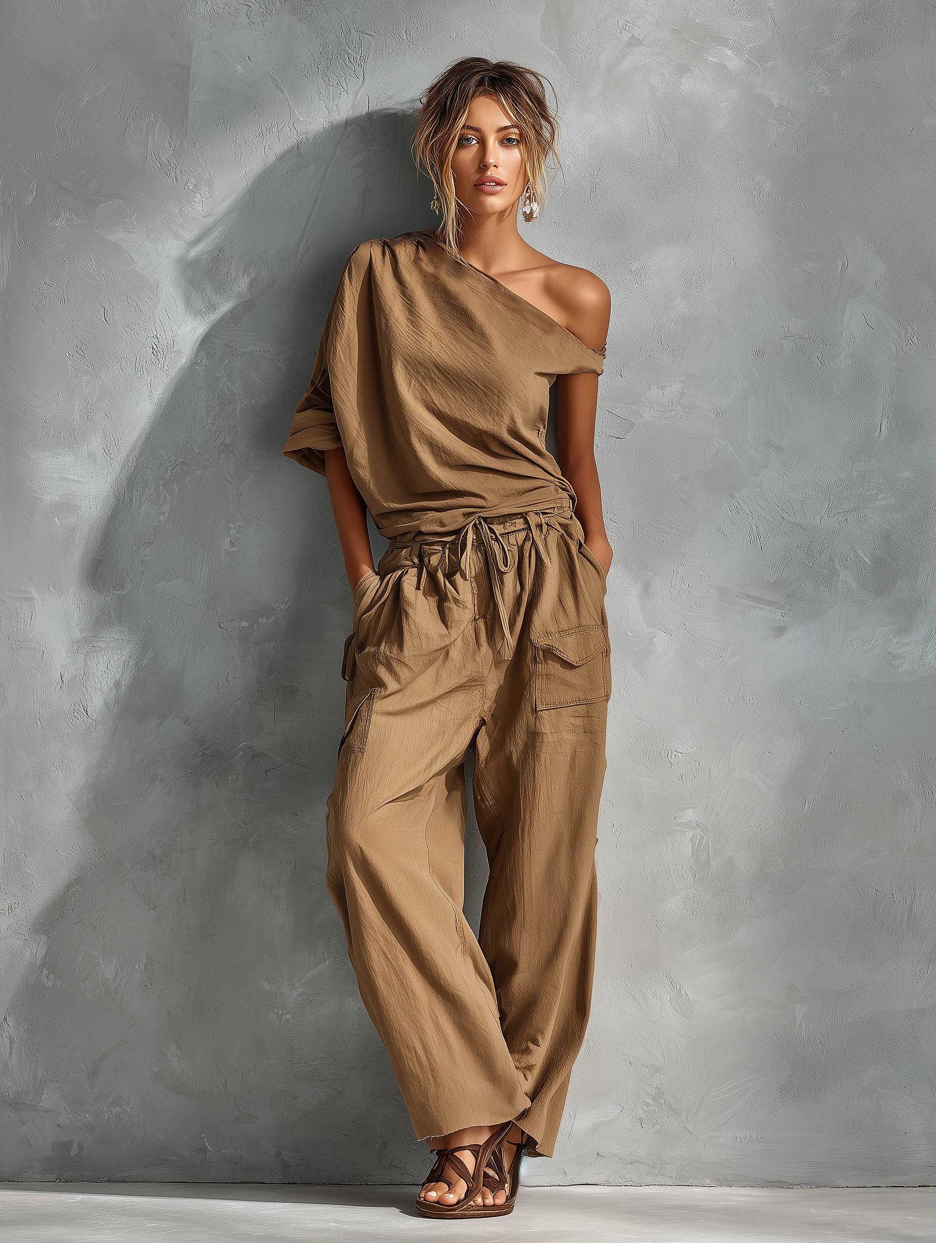 Women’s Camel Crinkled Cotton Asymmetrical One-Shoulder Ruched Crop Top And Linen-Blend Drawstring Waist Wide-Leg Cargo Pants Set