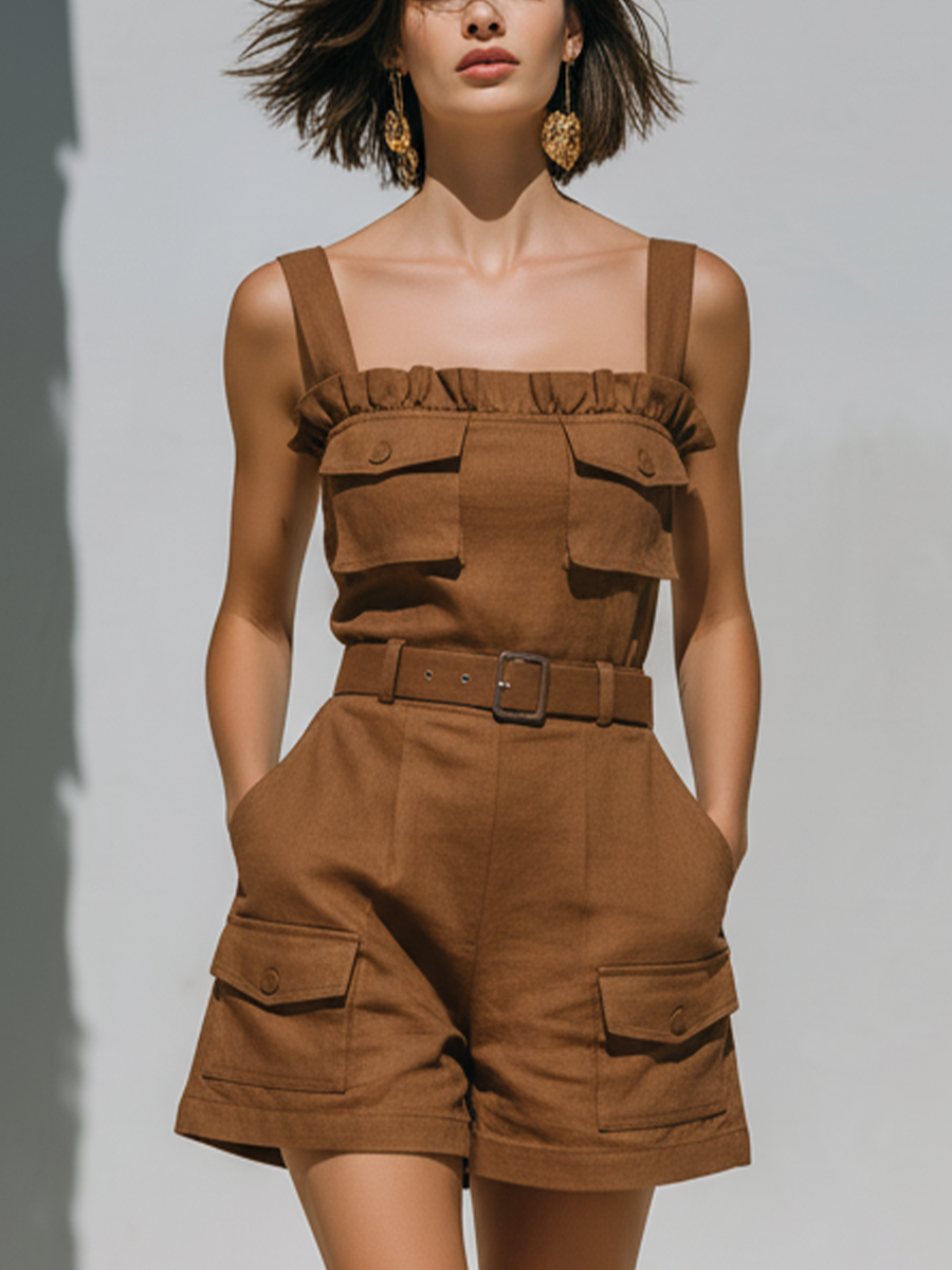 A chocolate brown linen-blend romper with a square neckline, ruffle trim, and a belted cargo style for an easy, stylish look.
