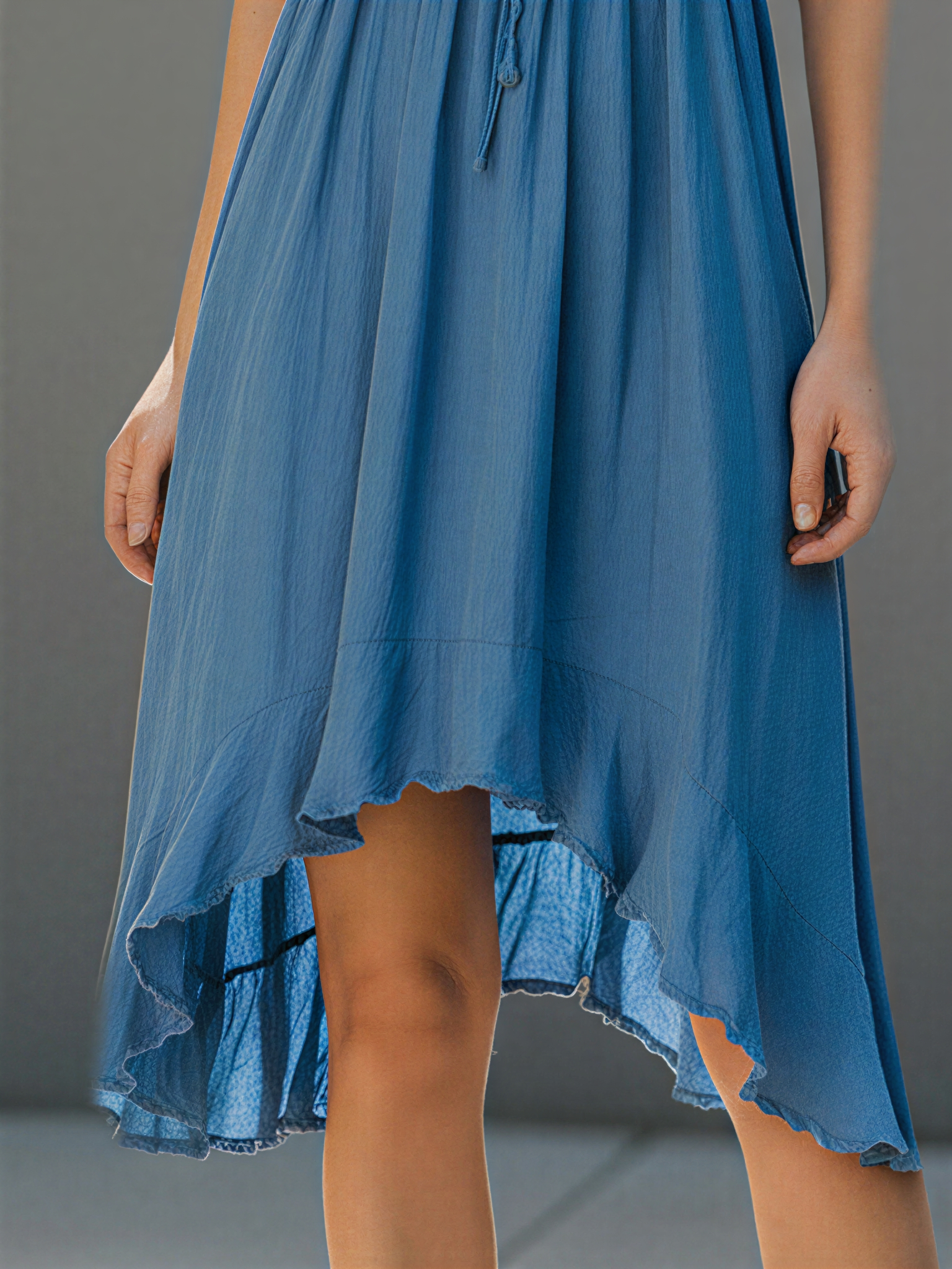This dusty blue midi dress features delicate embroidered trim along the neckline, adjustable spaghetti straps, and a tie-front detail. Its high-low hem adds soft movement, making it perfect for a relaxed yet feminine look.