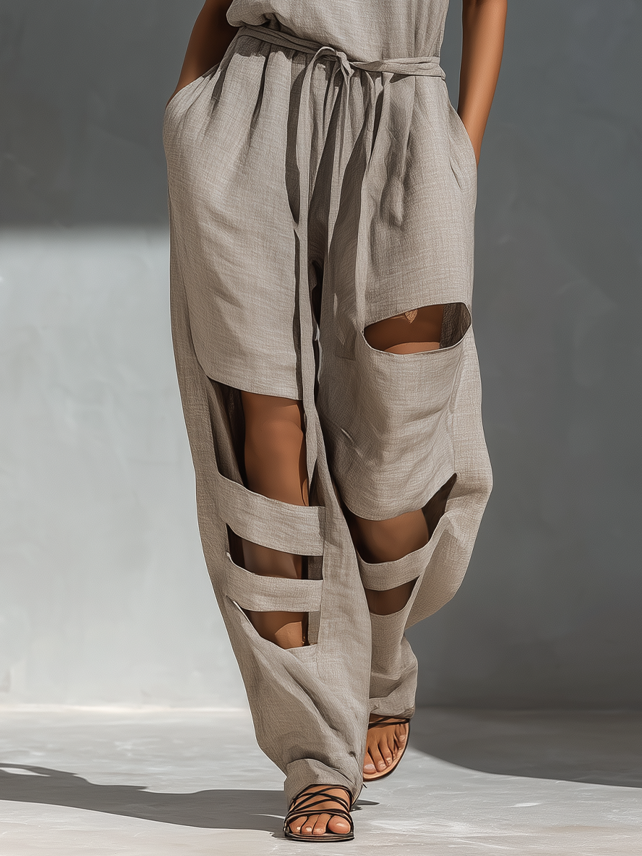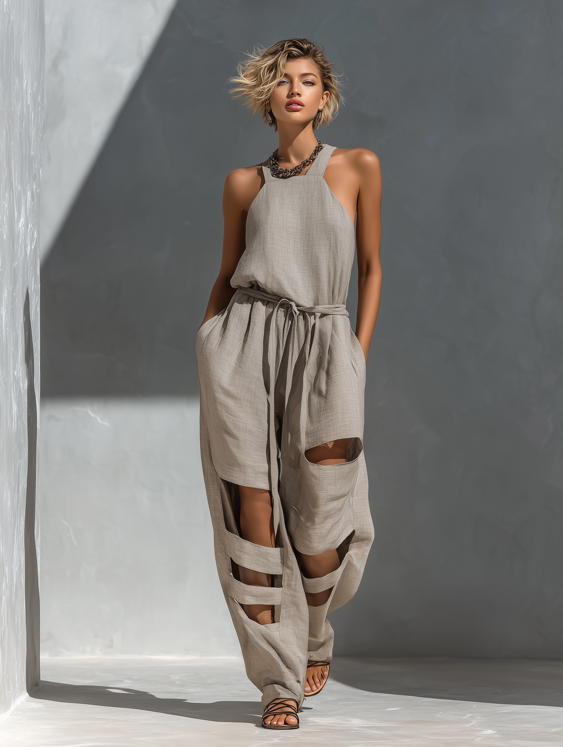 A stylish gray linen-blend halter neck jumpsuit with a belted waist and wide-leg fit for an easy, breezy look with standout cut-out details.