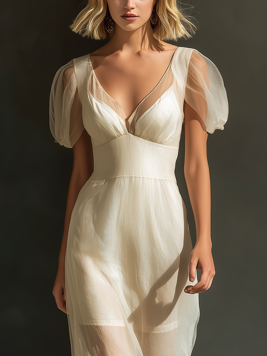 Women’s Ivory Sheer Chiffon Puff Sleeve V-Neck Empire Waist Maxi Dress