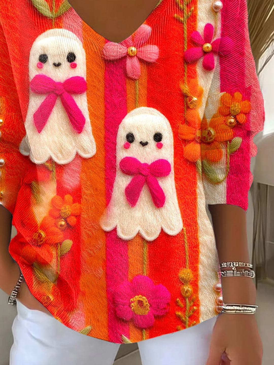Women's Long Sleeve T-shirt Spring/Fall Orange Red Halloween Printing V Neck Daily Going Out Casual Top