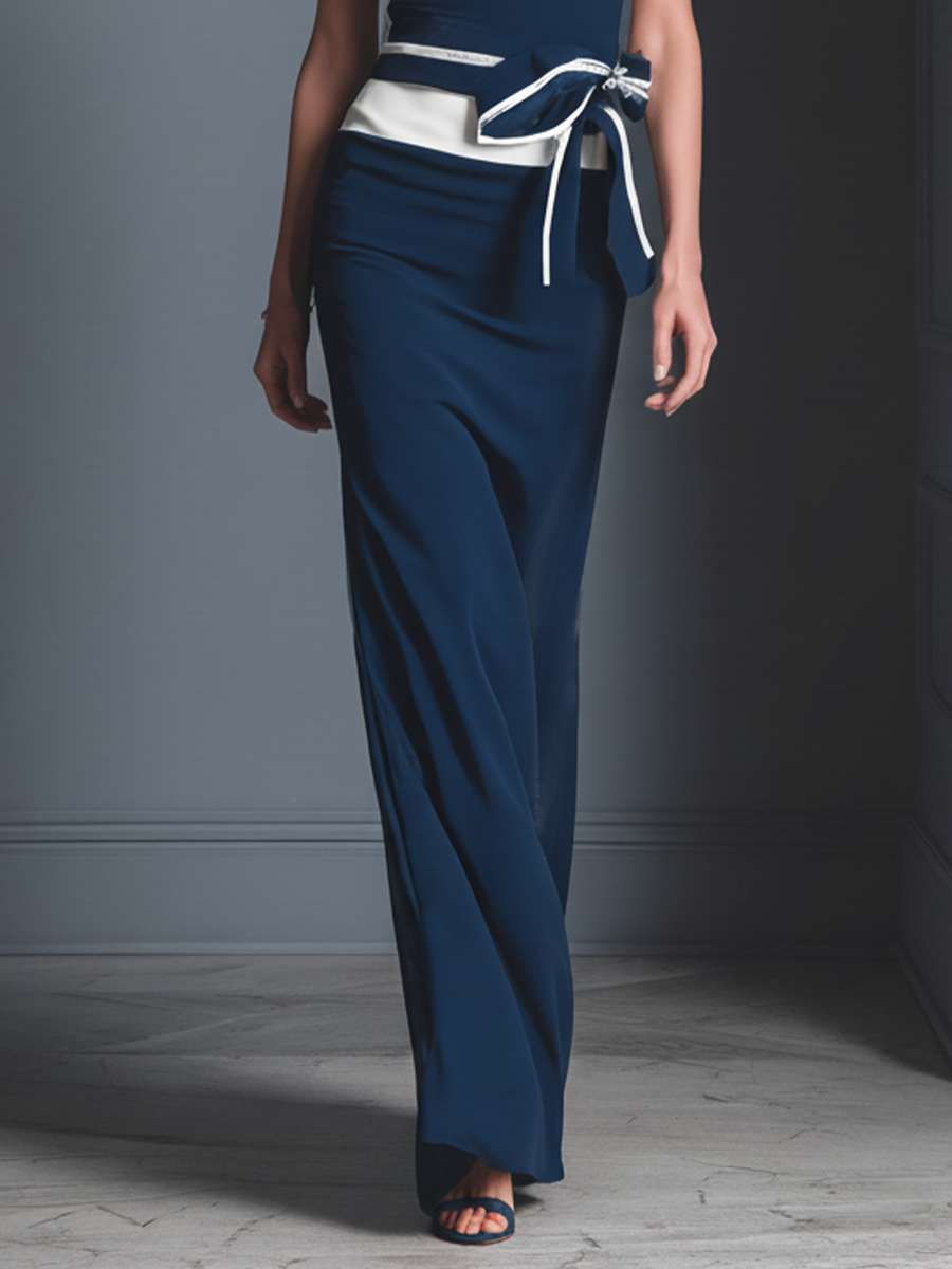 Women’s Navy Blue & White High-Elasticity Knit Striped Spaghetti Strap Belted Maxi Dress