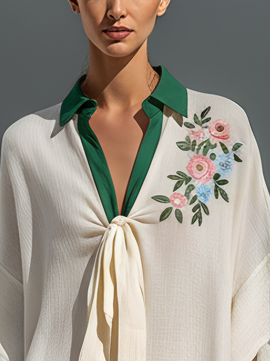 Women’s Off-White Linen-Blend Contrast Collar Floral Embroidered Tie-Neck Shift Mini Dress