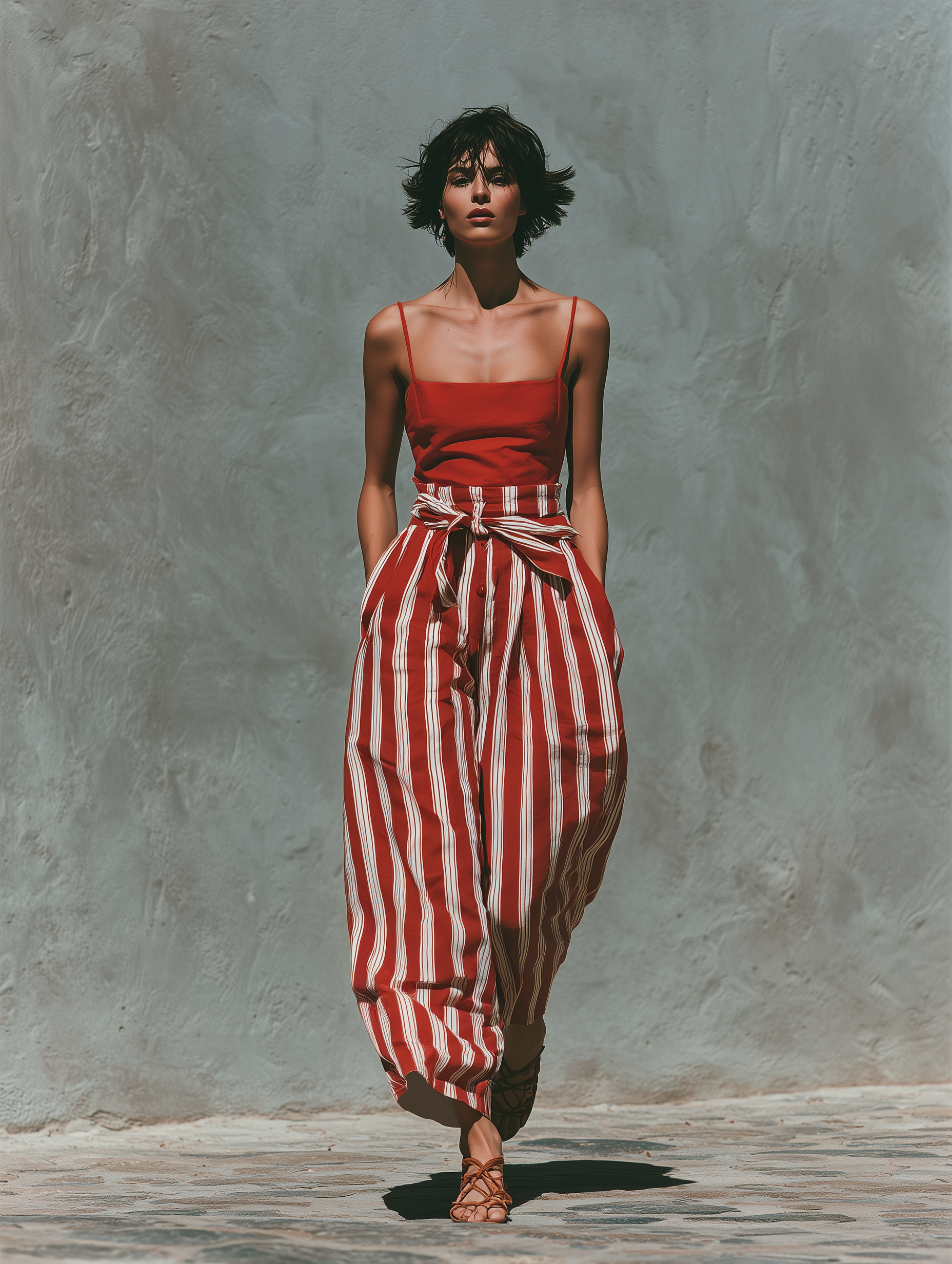 Women’s Red Linen-Blend Square Neck Spaghetti Strap Crop Top & Red White Stripe High-Waisted Wide-Leg Pants Two-Piece Set