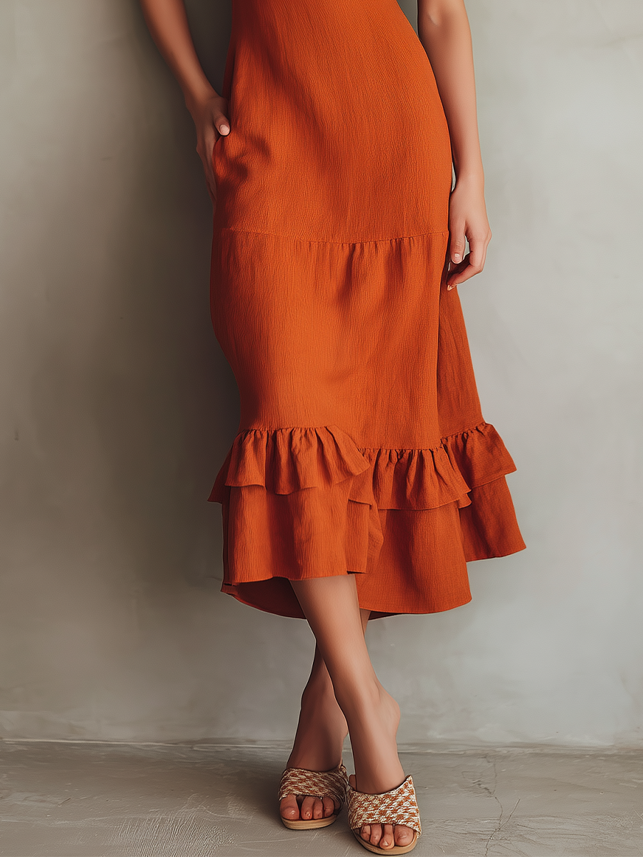Women’s Rust Orange Cotton Blend Fabric Ruffle Strap Tiered Midi Dress With Pockets