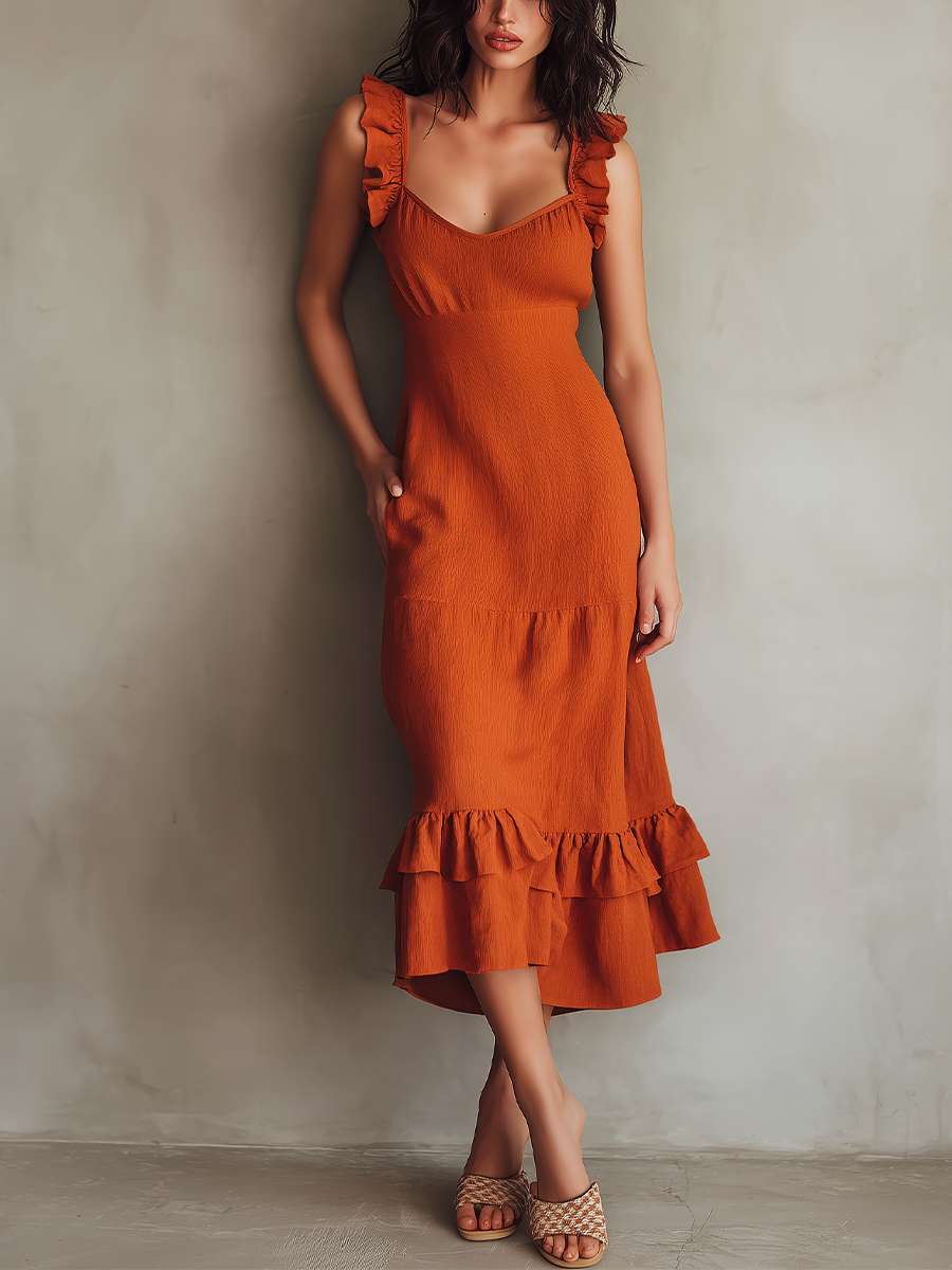 This rust orange midi dress features ruffle straps, tiered styling, and handy pockets for an easy everyday look.