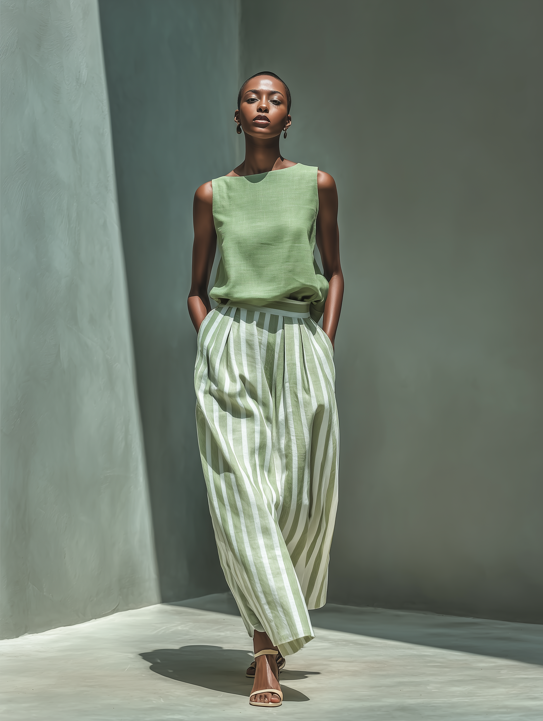 A two-piece set featuring a sage green solid top and a striped skirt in a linen-blend look.