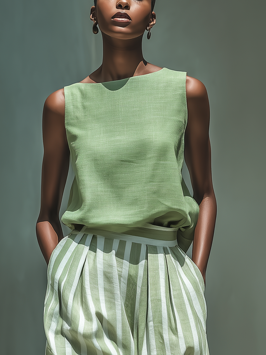Women’s Sage Green Linen-Blend Solid Top & Striped Skirt Two-Piece Set