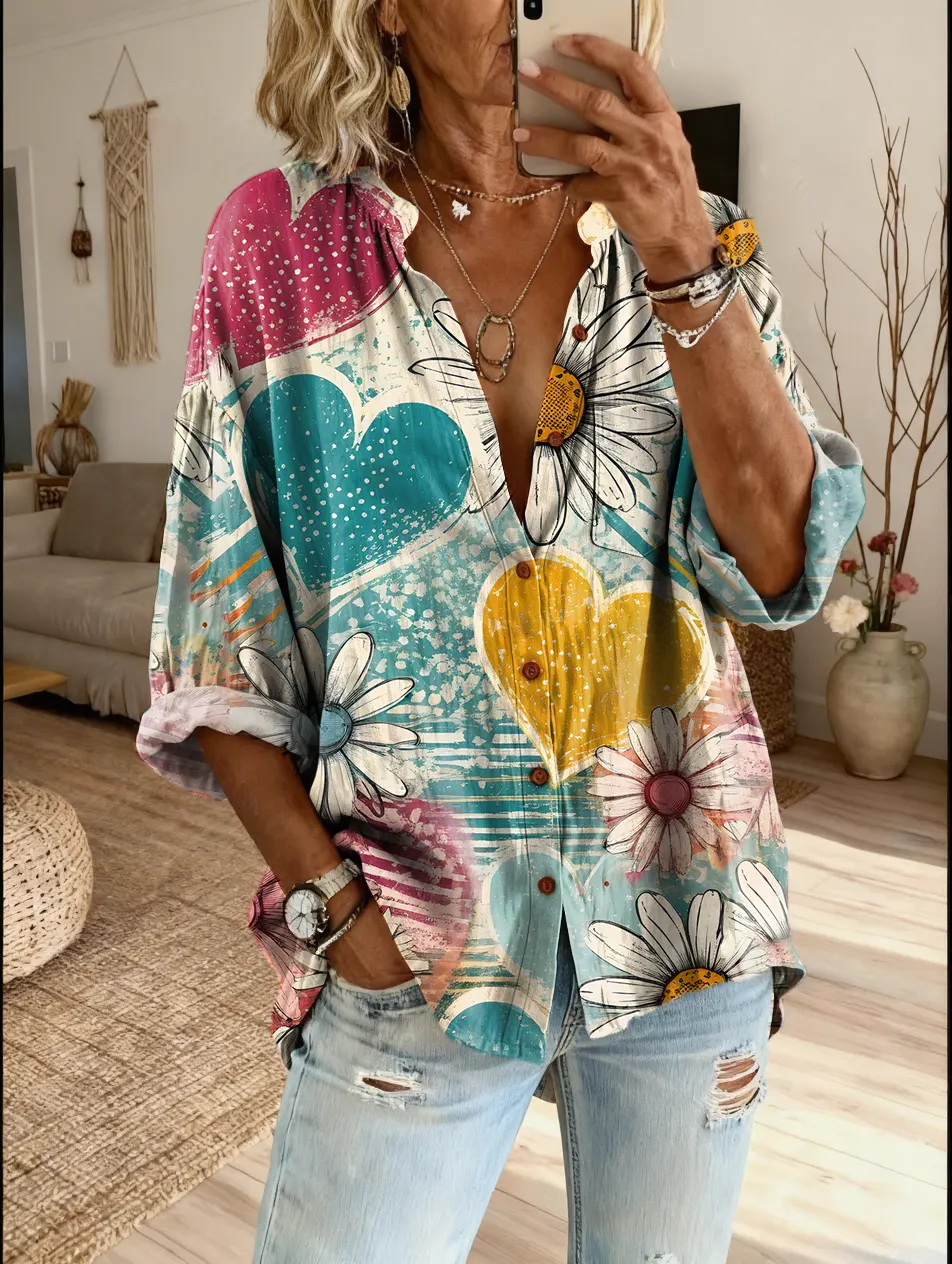 Women's Artistic Heart-shaped Daisy Print Casual Cotton-linen Blend Shirt