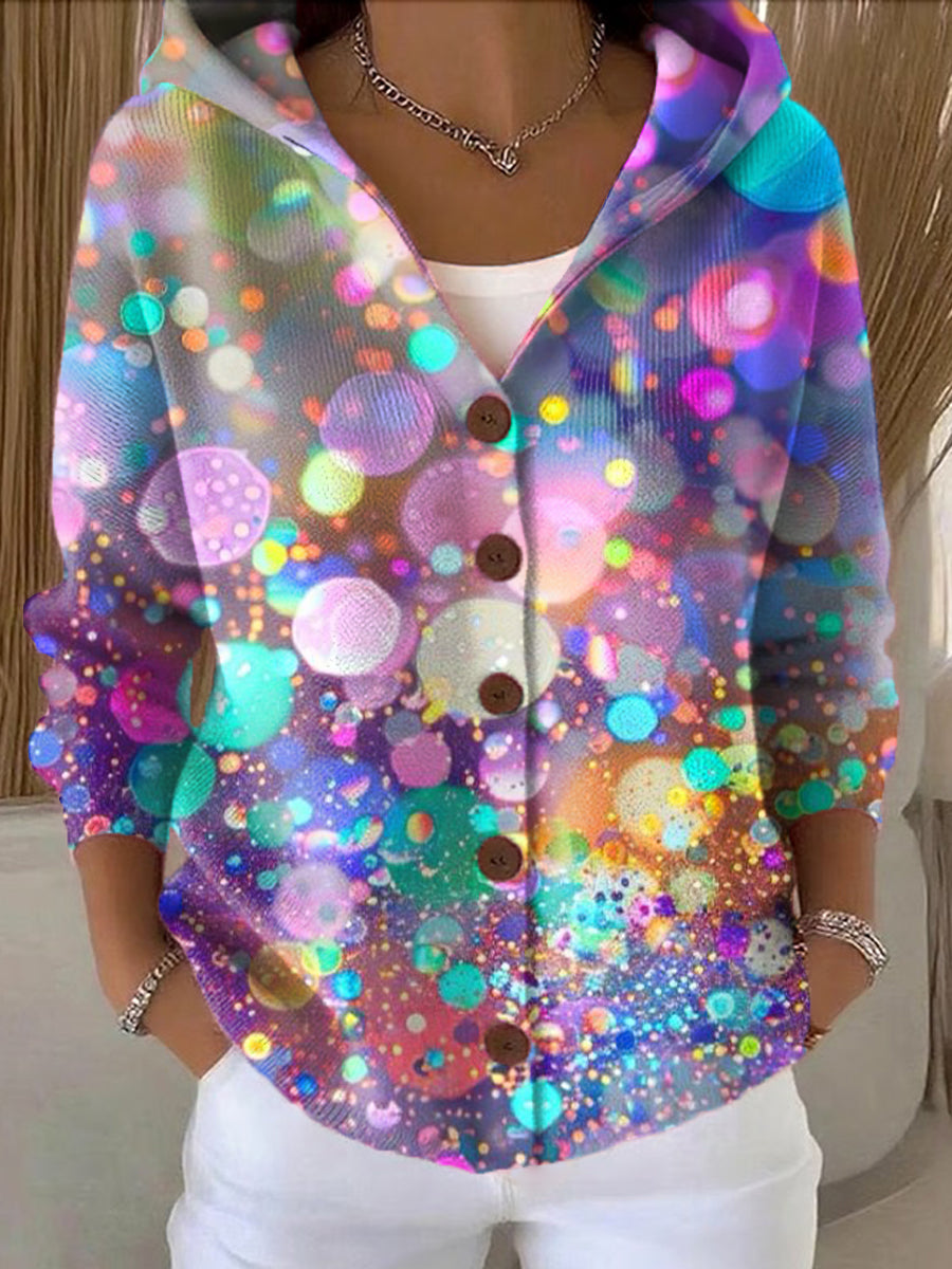 Women's Beautiful Colorful Polka Dot Art Print Casual Hooded Button Sweater