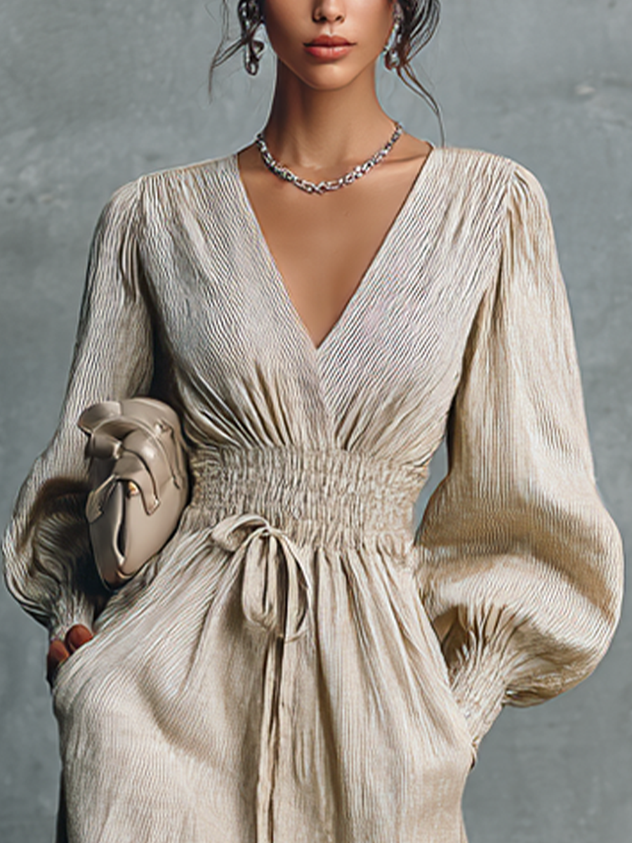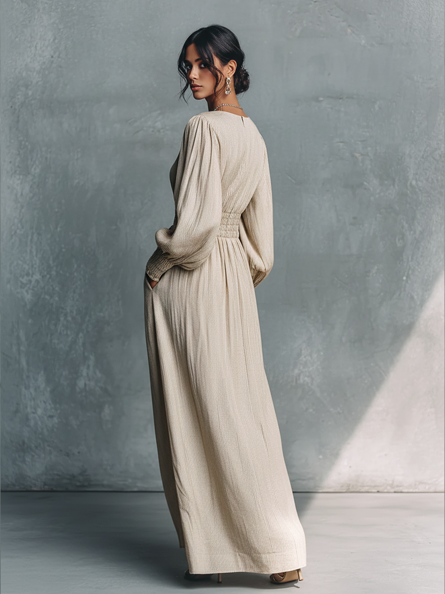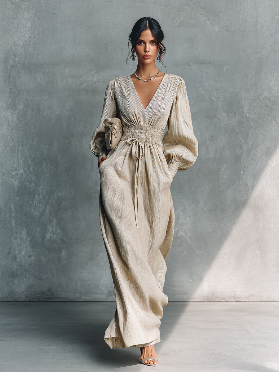 This elegant beige maxi dress is crafted from a comfortable cotton linen blend with a subtle striped texture, featuring a flattering V-neckline and voluminous long sleeves with elasticated cuffs. The shirred elasticated waist with an adjustable drawstring creates a beautiful silhouette, making it a perfect blend of comfort and sophisticated style for various casual and semi-formal occasions.
