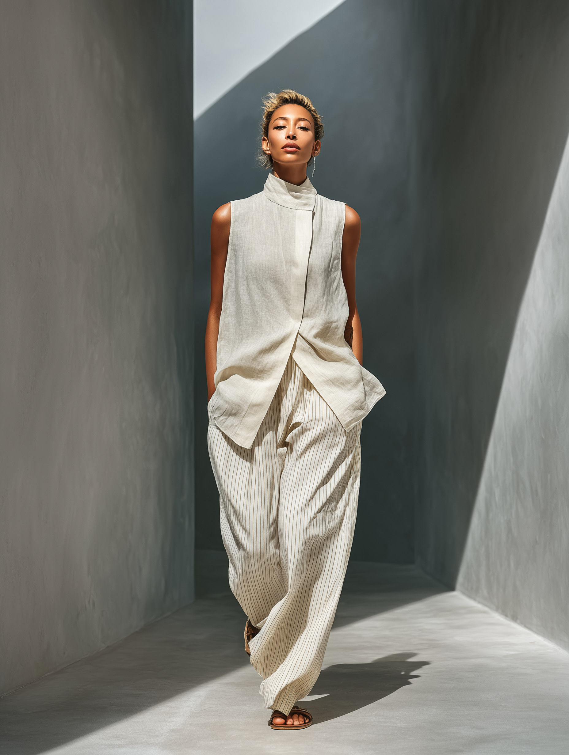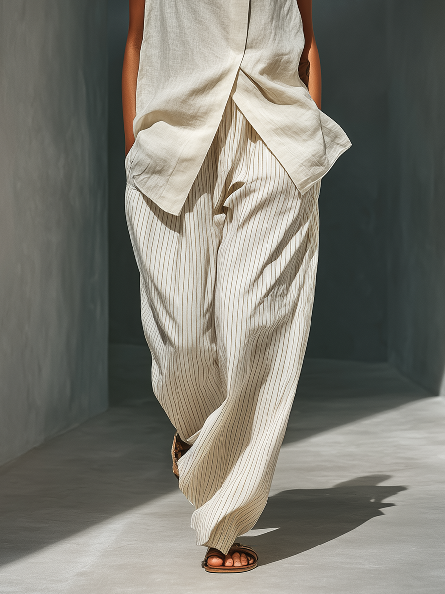 Beige linen two-piece set with a high neck wrap top and striped wide-leg trousers for an airy, easy summer look.