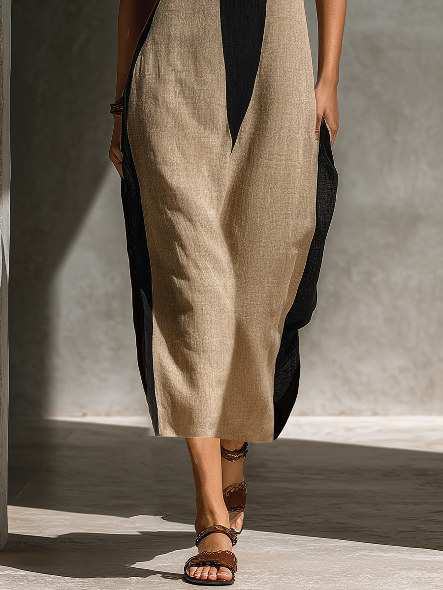 Women's Black And Beige Cotton Blend Halter Neck Midi Dress With Keyhole Cutout & Color Block Design
