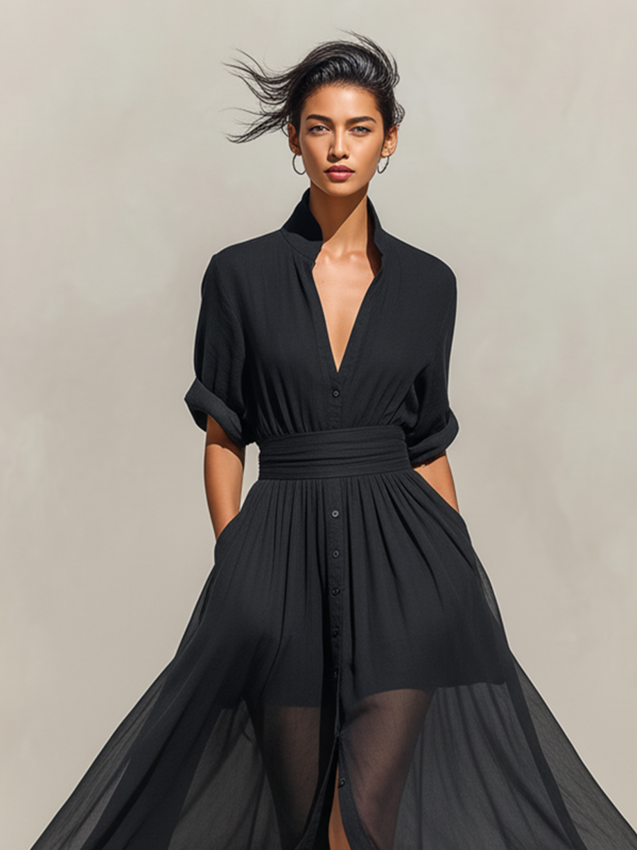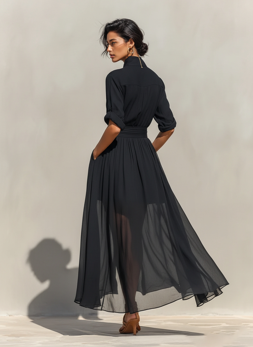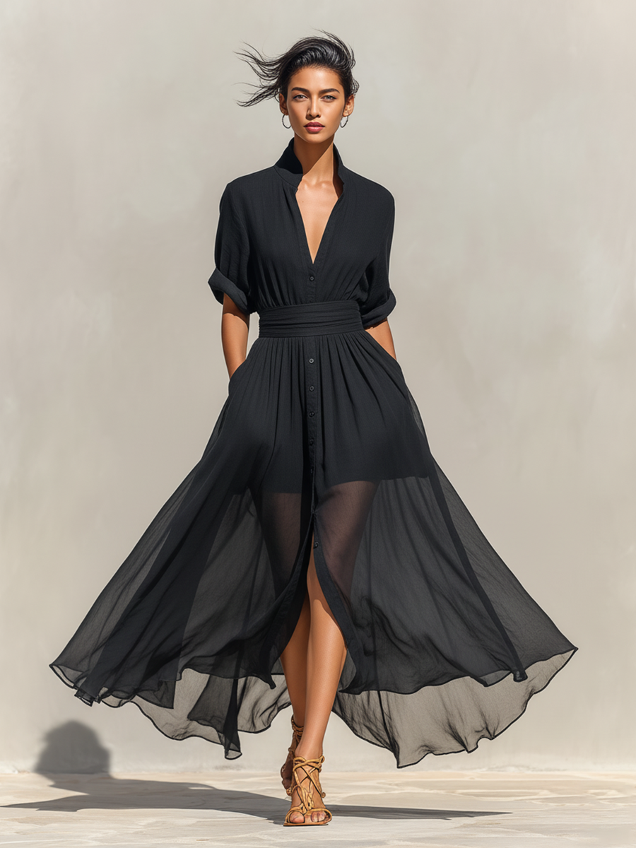 This black rayon dress features a sheer overlay and elasticated waist for a balanced blend of elegance and comfort. Its flowy design and modern silhouette make it ideal for resort evenings or stylish getaways.