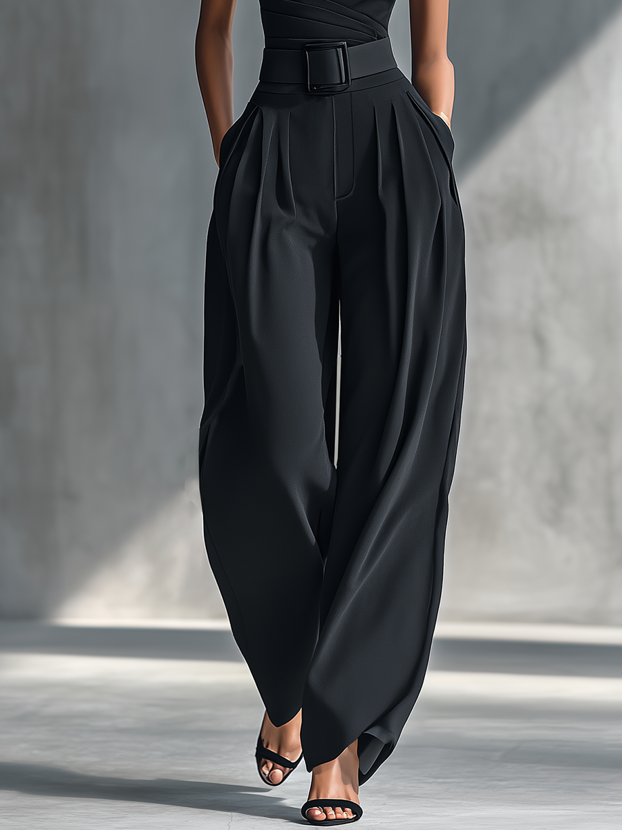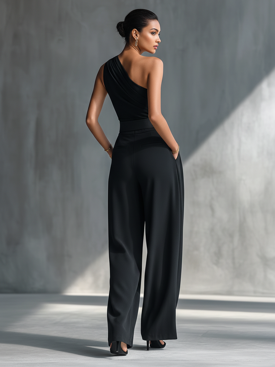 Women's Black High-elastic Knit Top And Acetate Wide-leg Pants