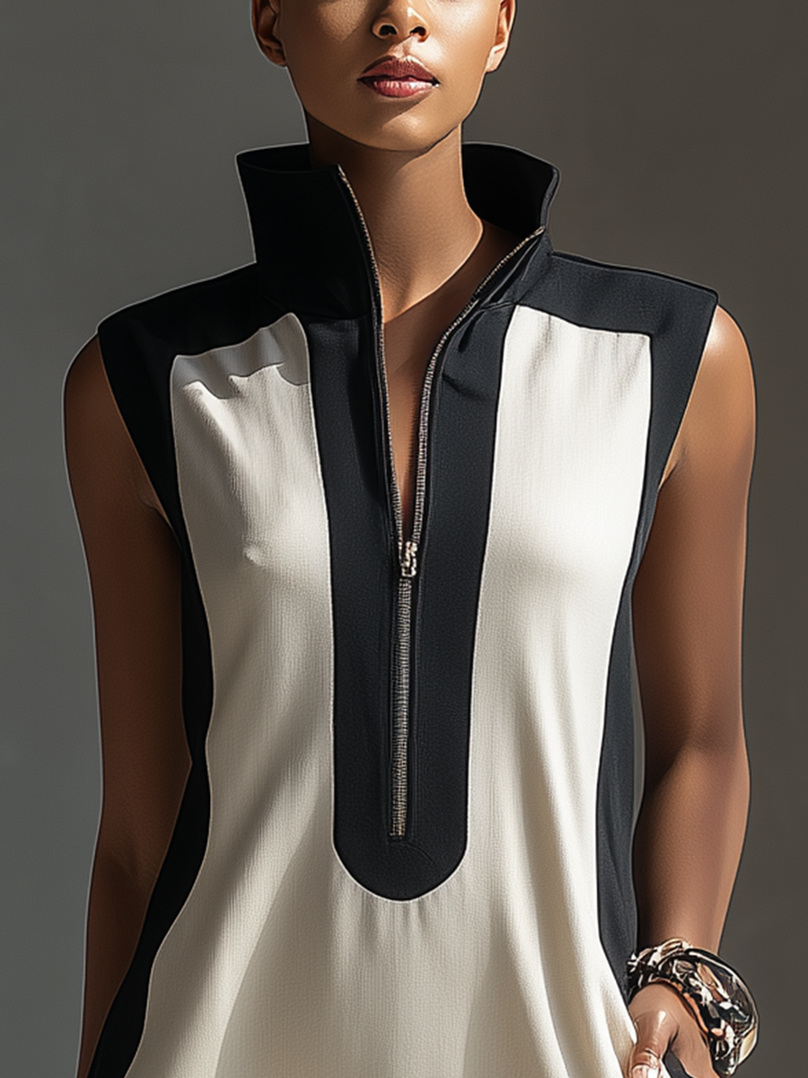 A chic color-block mini dress in cream and black, featuring a stand collar and a central half-zip for modern edge.