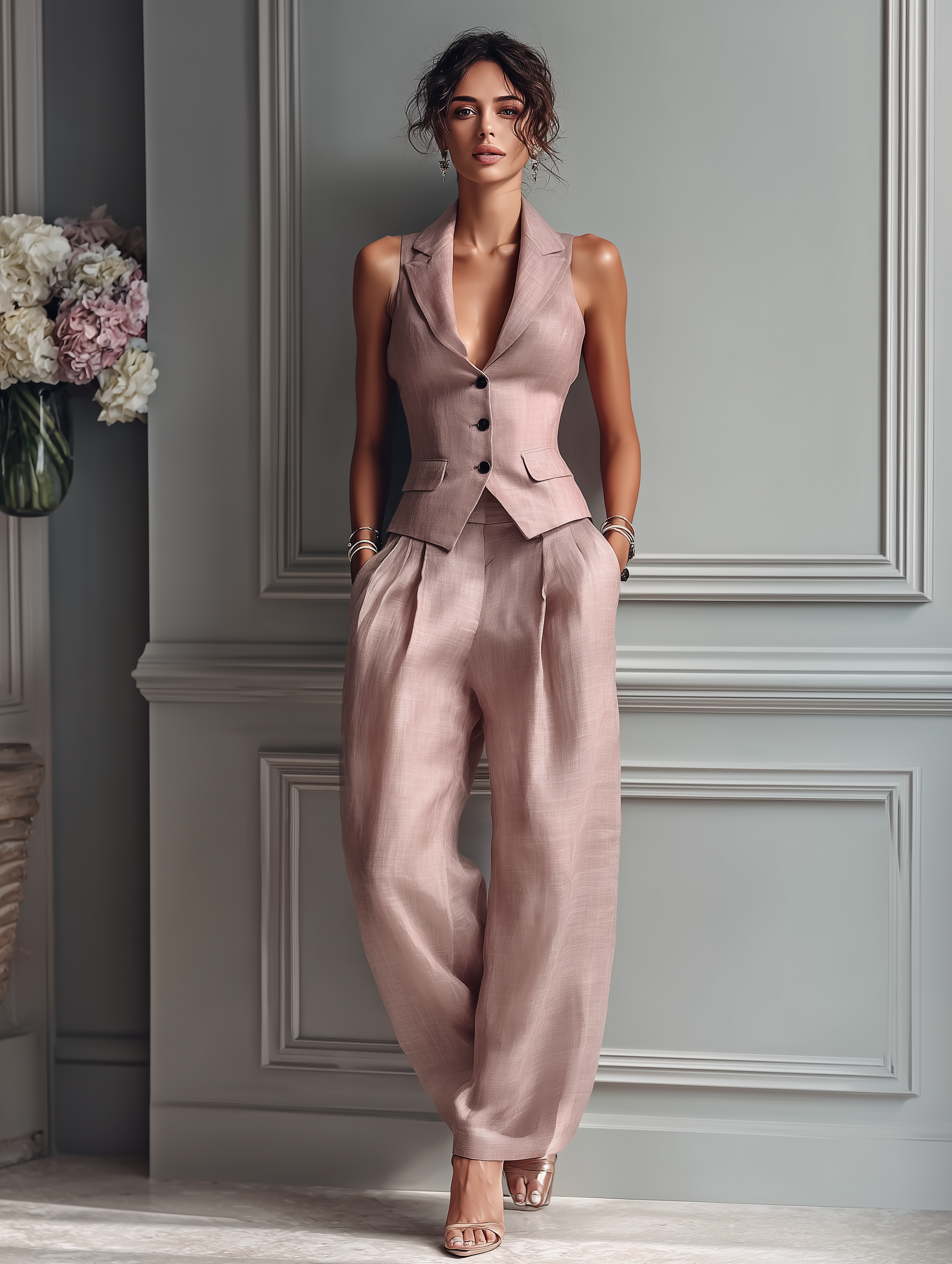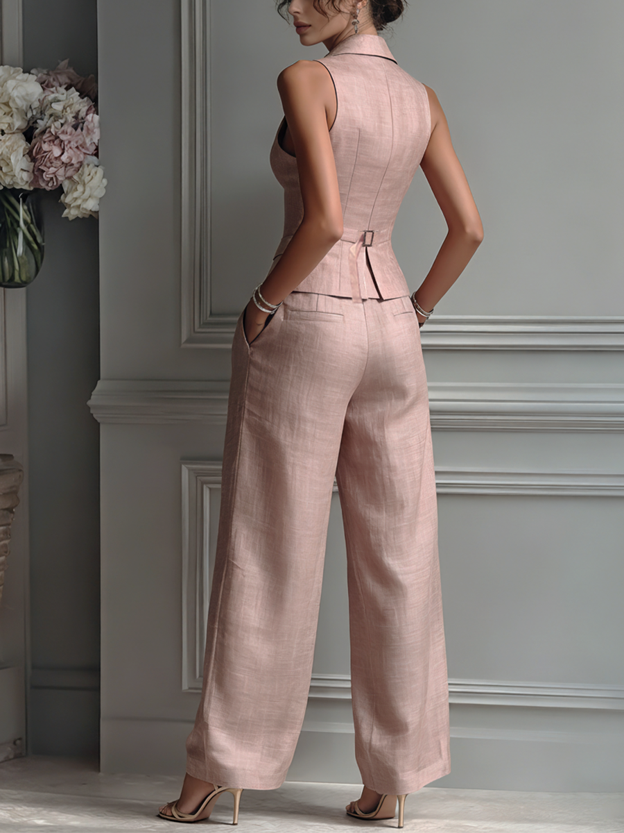 A chic blush pink linen set featuring a sleeveless vest and high-waisted wide-leg pants with a lapel collar for a polished, casual-elegant look.