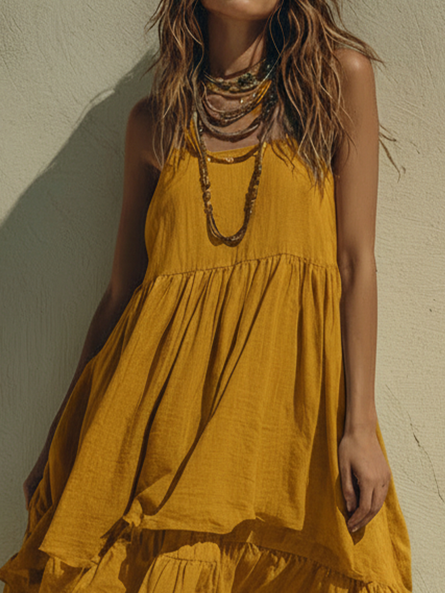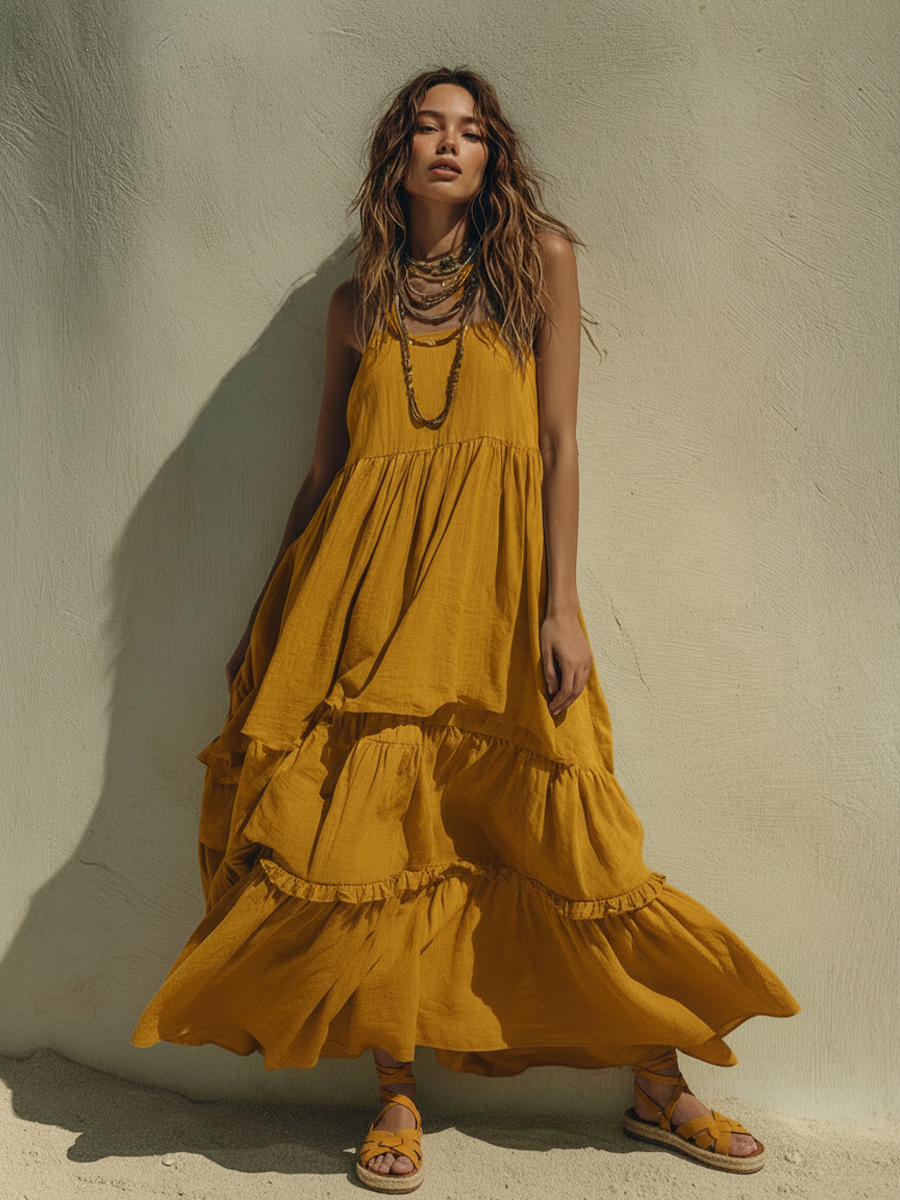 Women's Bohemian Mustard Yellow Cotton Linen Ruffled Spaghetti Strap Maxi Dress