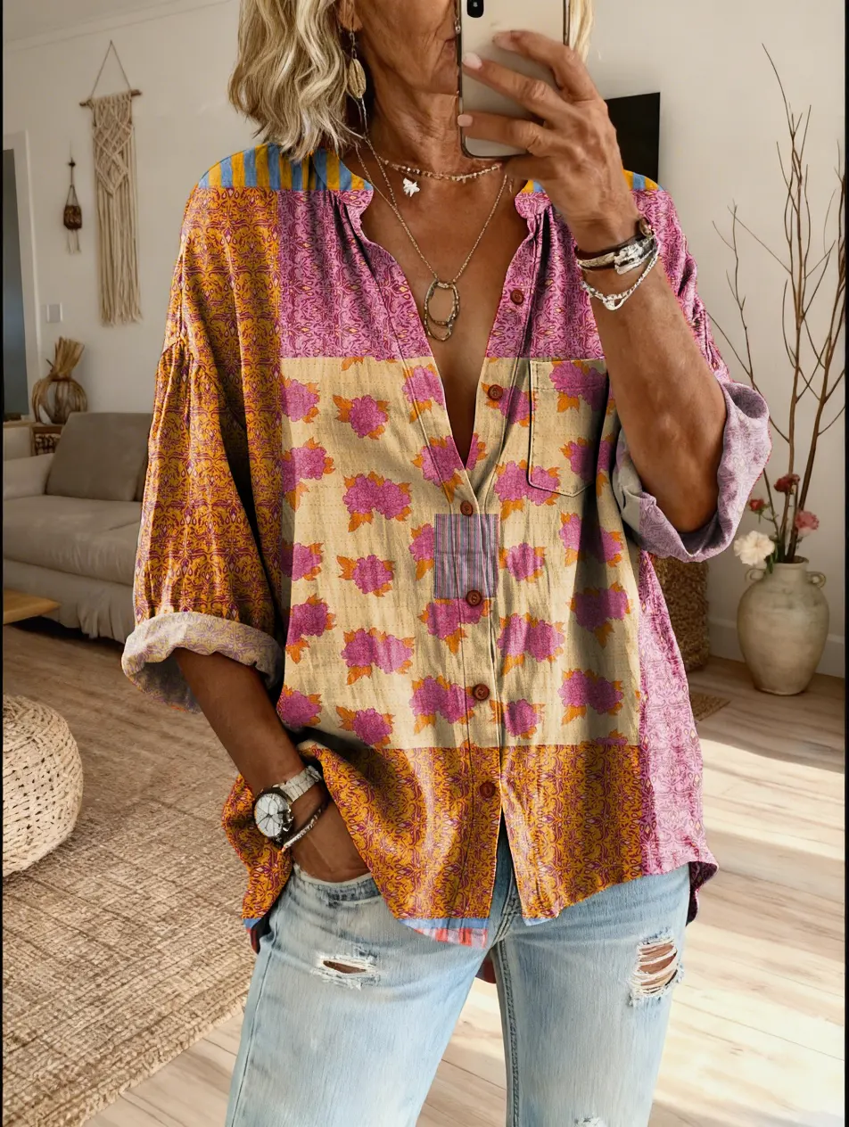 Women's Bohemian Patchwork Floral Art Print Casual Cotton-Linen Shirt