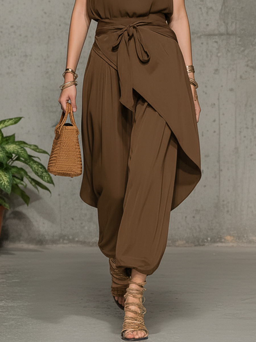A rich brown bohemian-inspired outfit featuring an off-shoulder top with delicate tie detailing and a relaxed-fit asymmetrical skort set for effortless elegance and comfort.