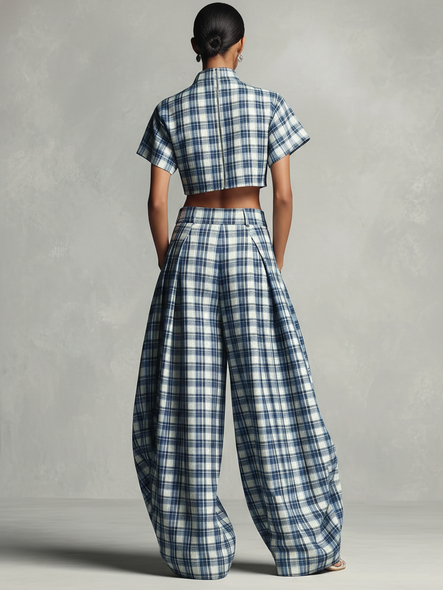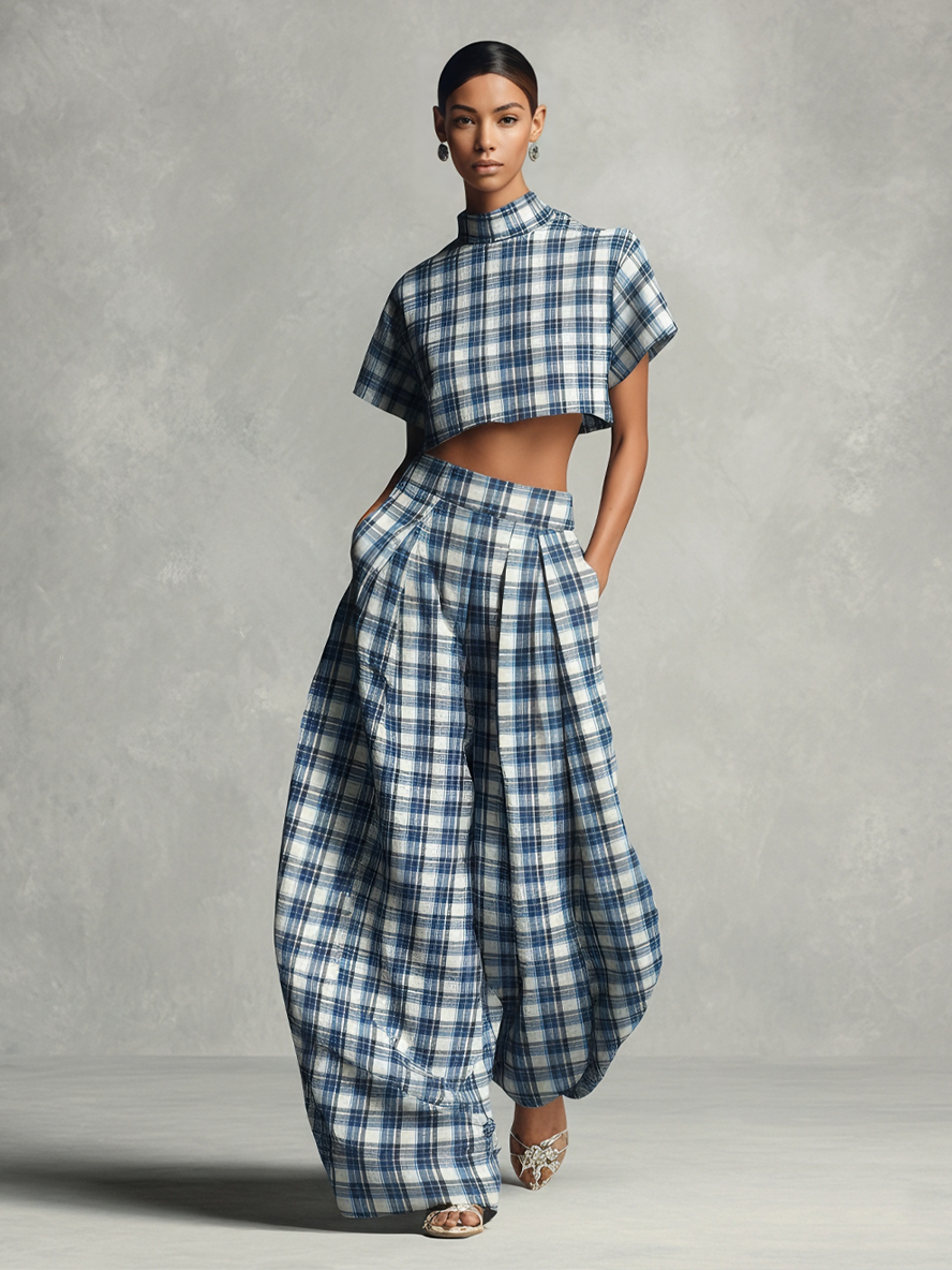 This striking two-piece set is crafted from crisp cotton fabric and features a blue and white plaid pattern, including a structured high-neck crop top and flowing wide-leg pants.