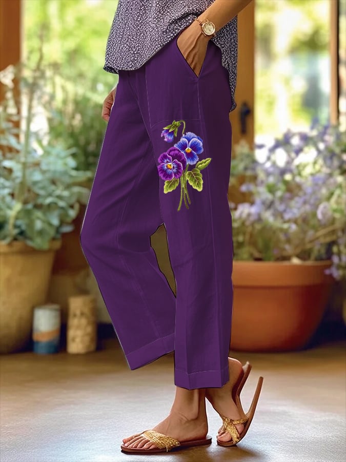 Women's Botanical Floral Design Loose Pocket Patchwork Casual Pants