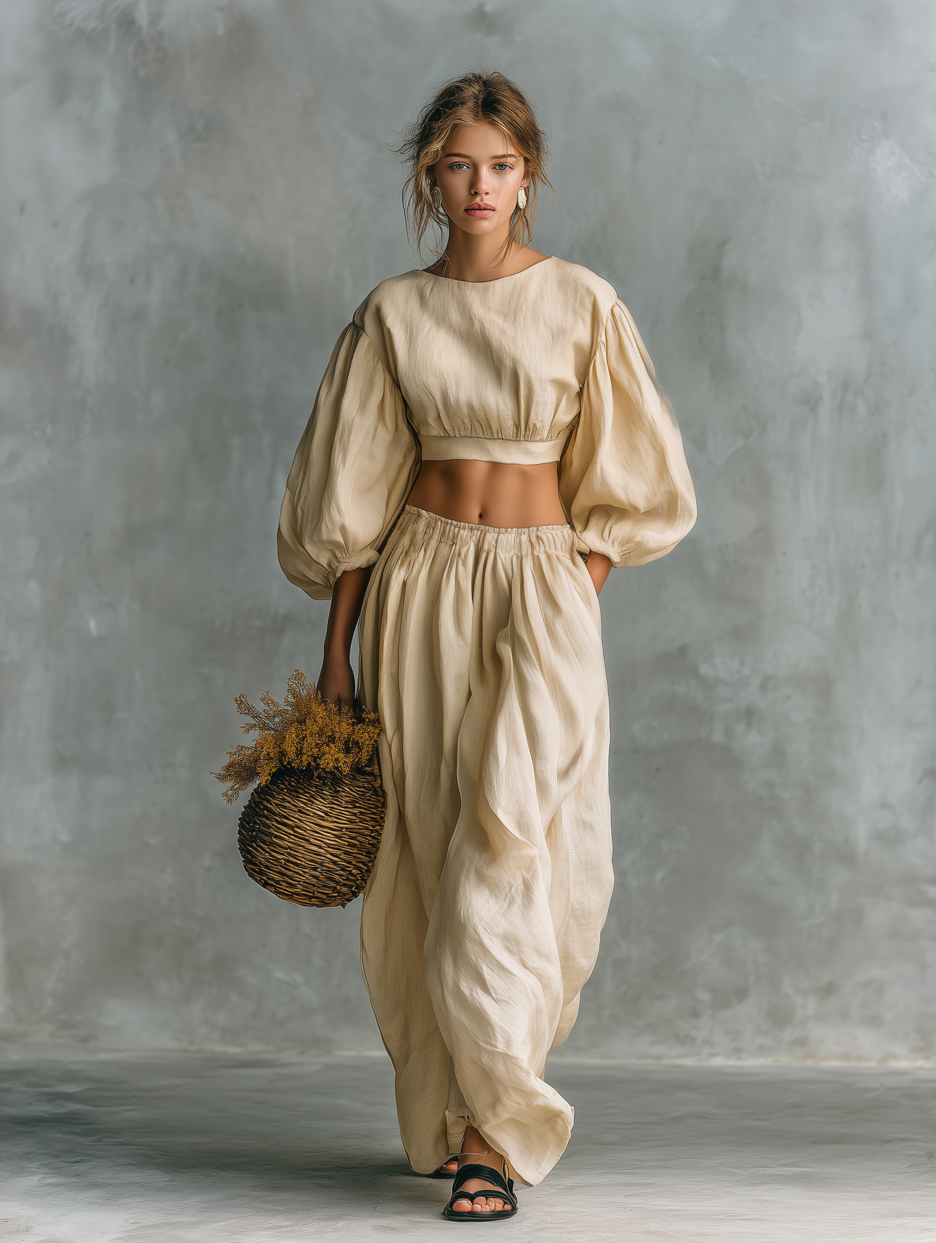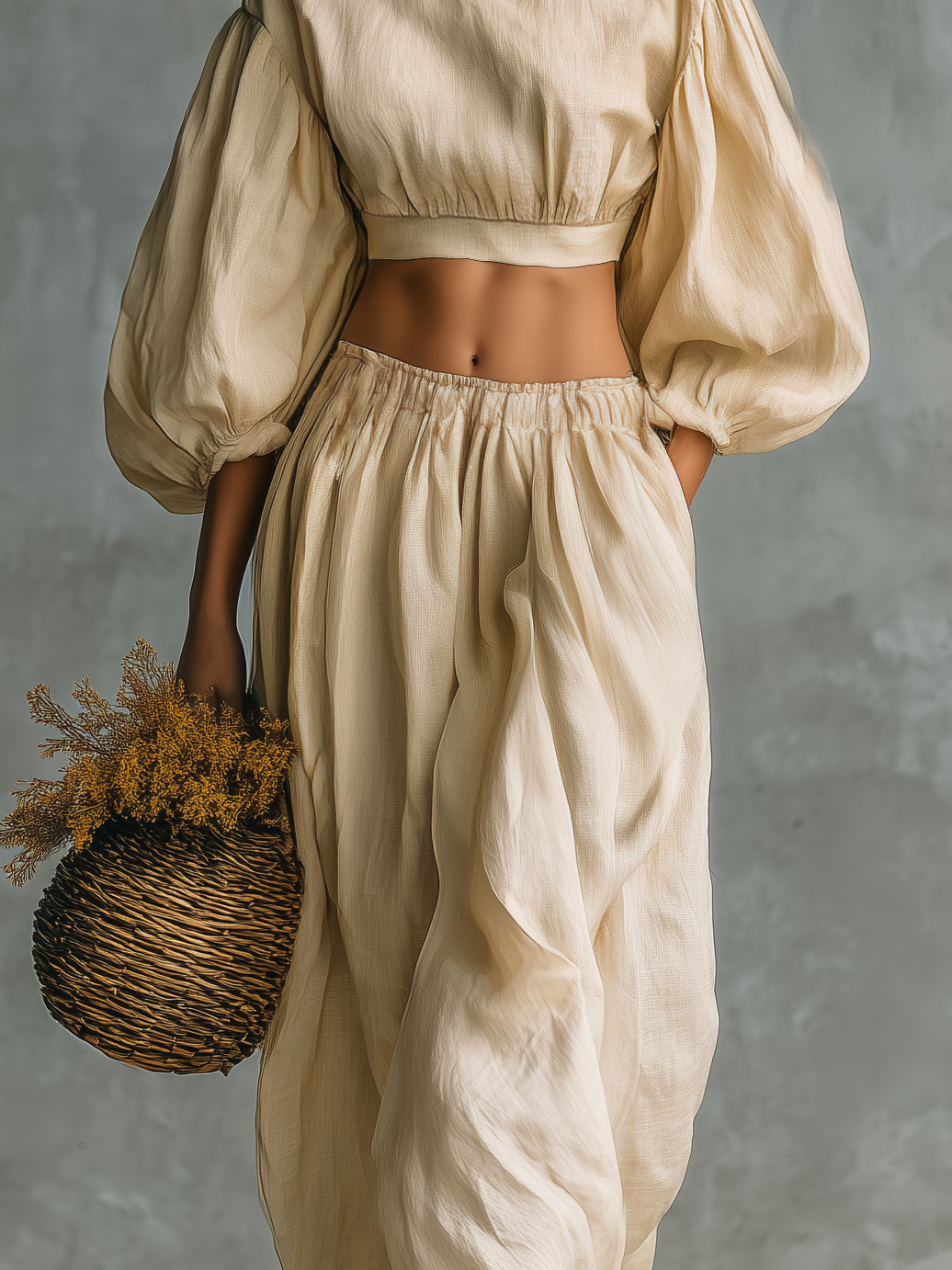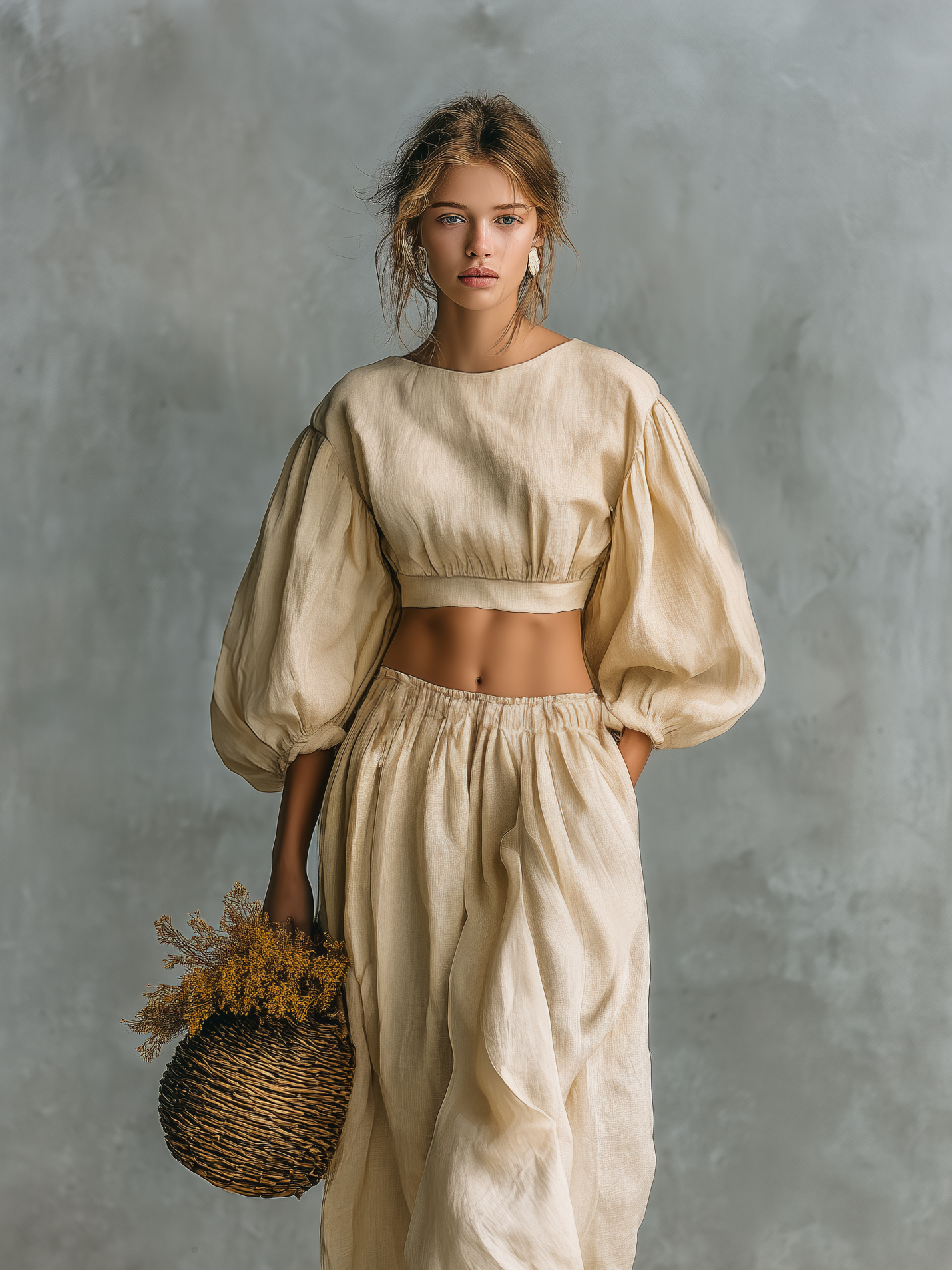 A relaxed and versatile two-piece set crafted from a breathable cotton-linen blend in a soft beige tone. Featuring a classic crew-neck long-sleeve top paired with matching trousers, this outfit offers a comfortable and effortless silhouette, perfect for everyday wear.