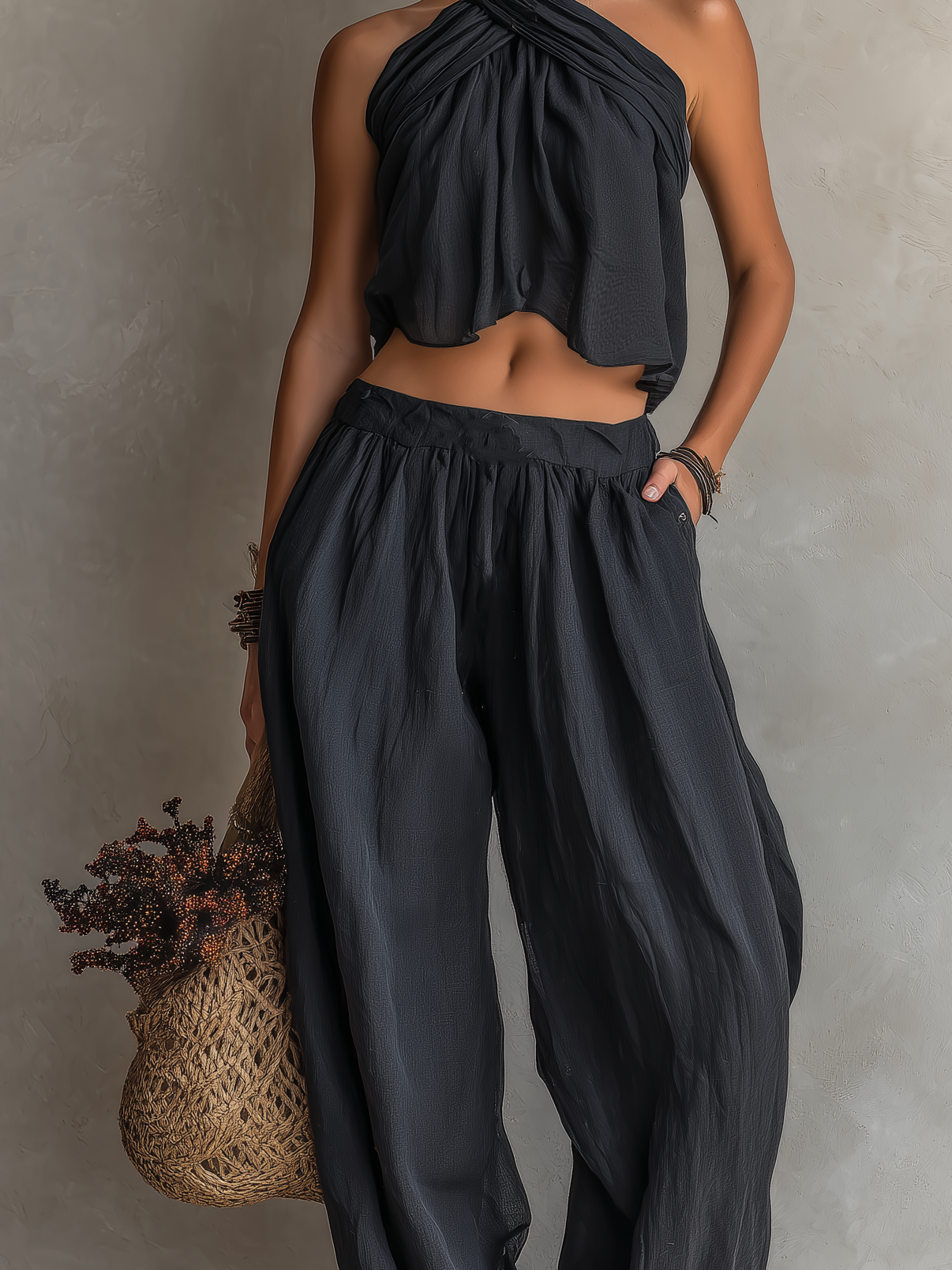 A stylish and comfortable two-piece outfit crafted from a breathable cotton-linen blend in classic black. Featuring a halter-neck sleeveless top paired with matching trousers, this set offers a modern silhouette with a relaxed fit, perfect for effortless everyday styling.