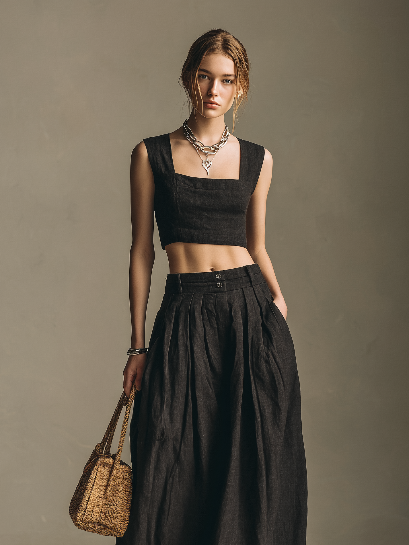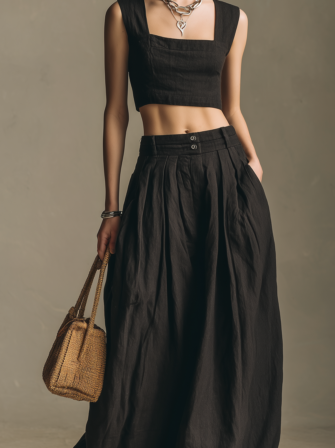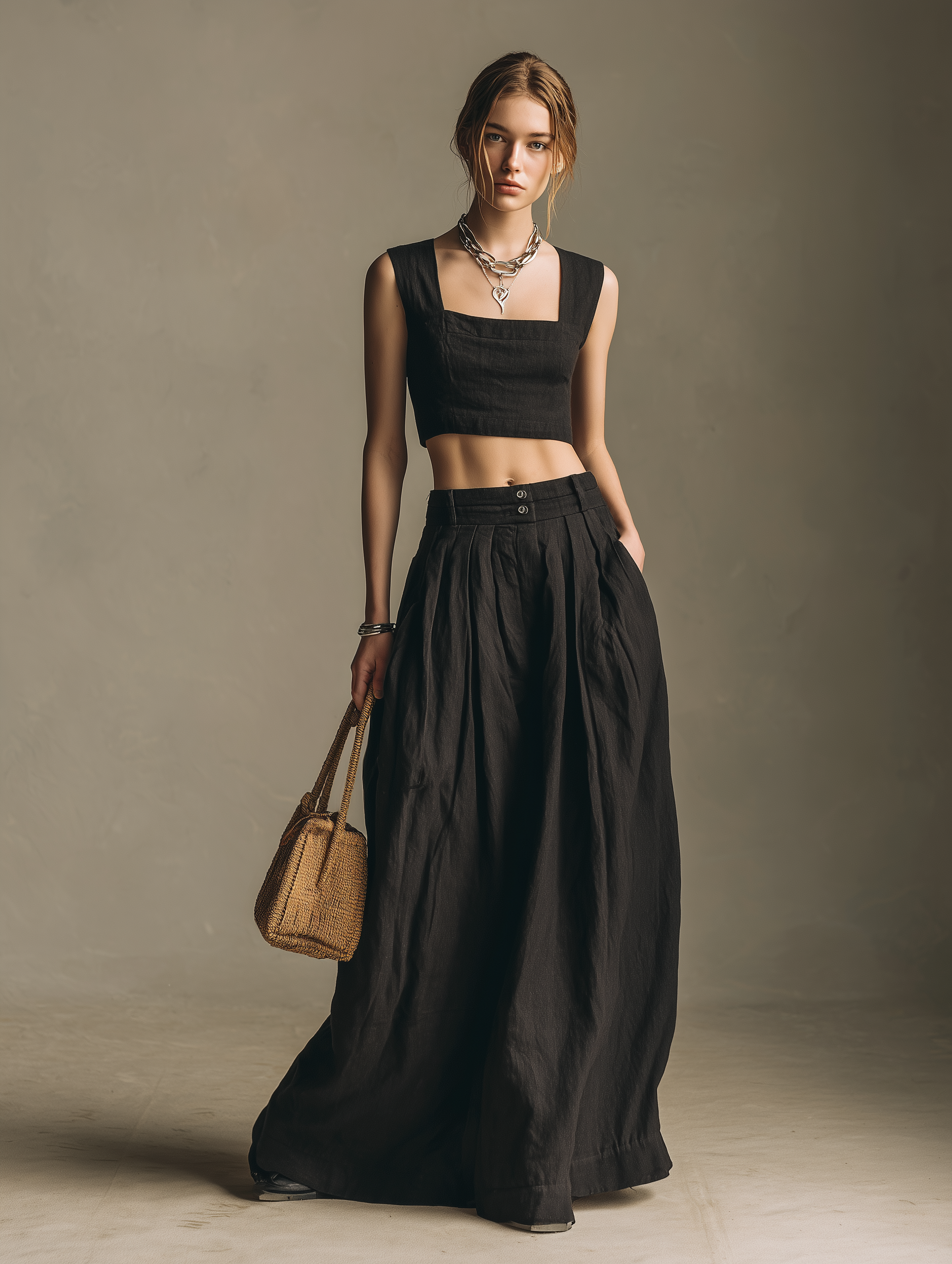 A stylish and relaxed two-piece set crafted from a breathable cotton-linen blend in classic black. Featuring a square-neck sleeveless top paired with a flowing long skirt, this outfit offers a clean silhouette with effortless comfort and understated elegance.