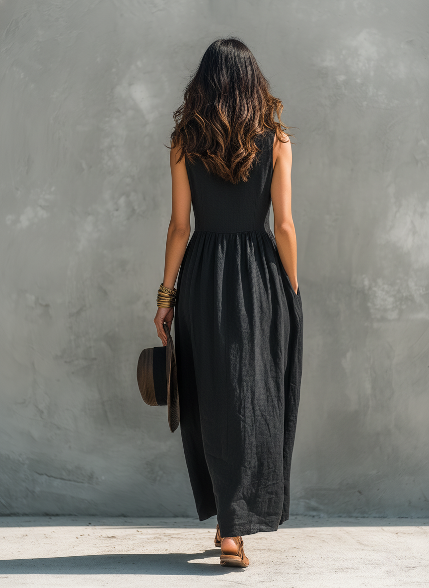 Product Name: Women’s Casual Black Cotton Linen V-Neck Sleeveless Long Dress
