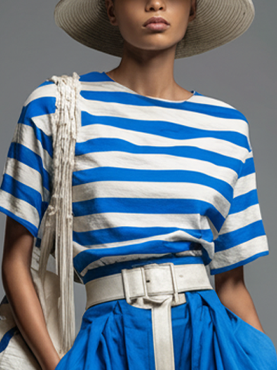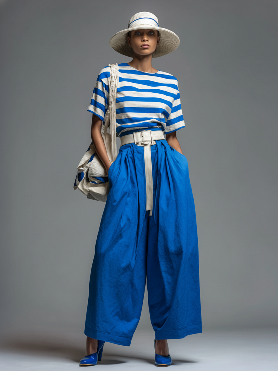 Women's Casual Blue And White Striped Cotton-Blend T-Shirt and Blue Wide-Leg Pants Set (Belt Not Included)
