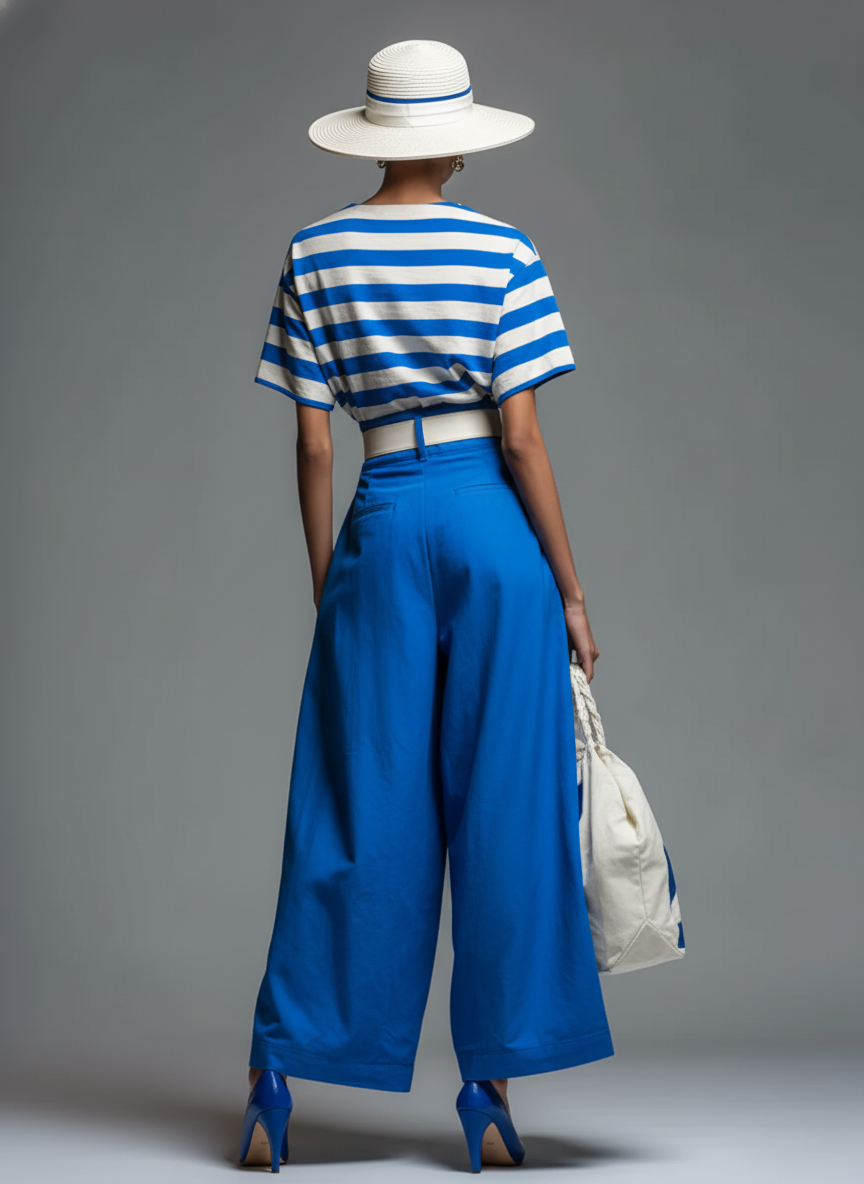 A relaxed two-piece set featuring a classic blue and white striped t-shirt paired with flowy wide-leg blue pants.