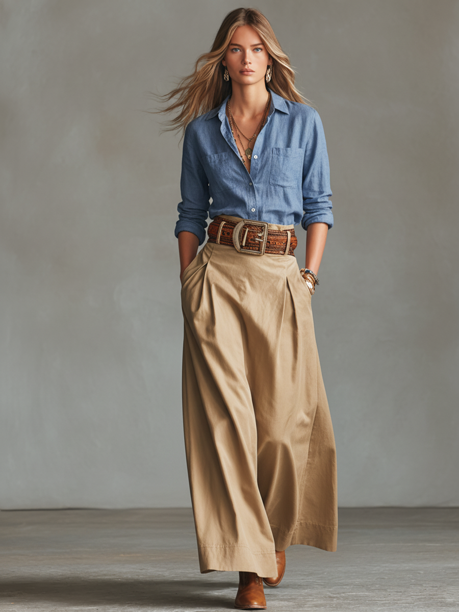 Women's Casual Blue Cotton-Linen Top And Khaki Cotton-Blend Skirt Set (Belt Not Included)