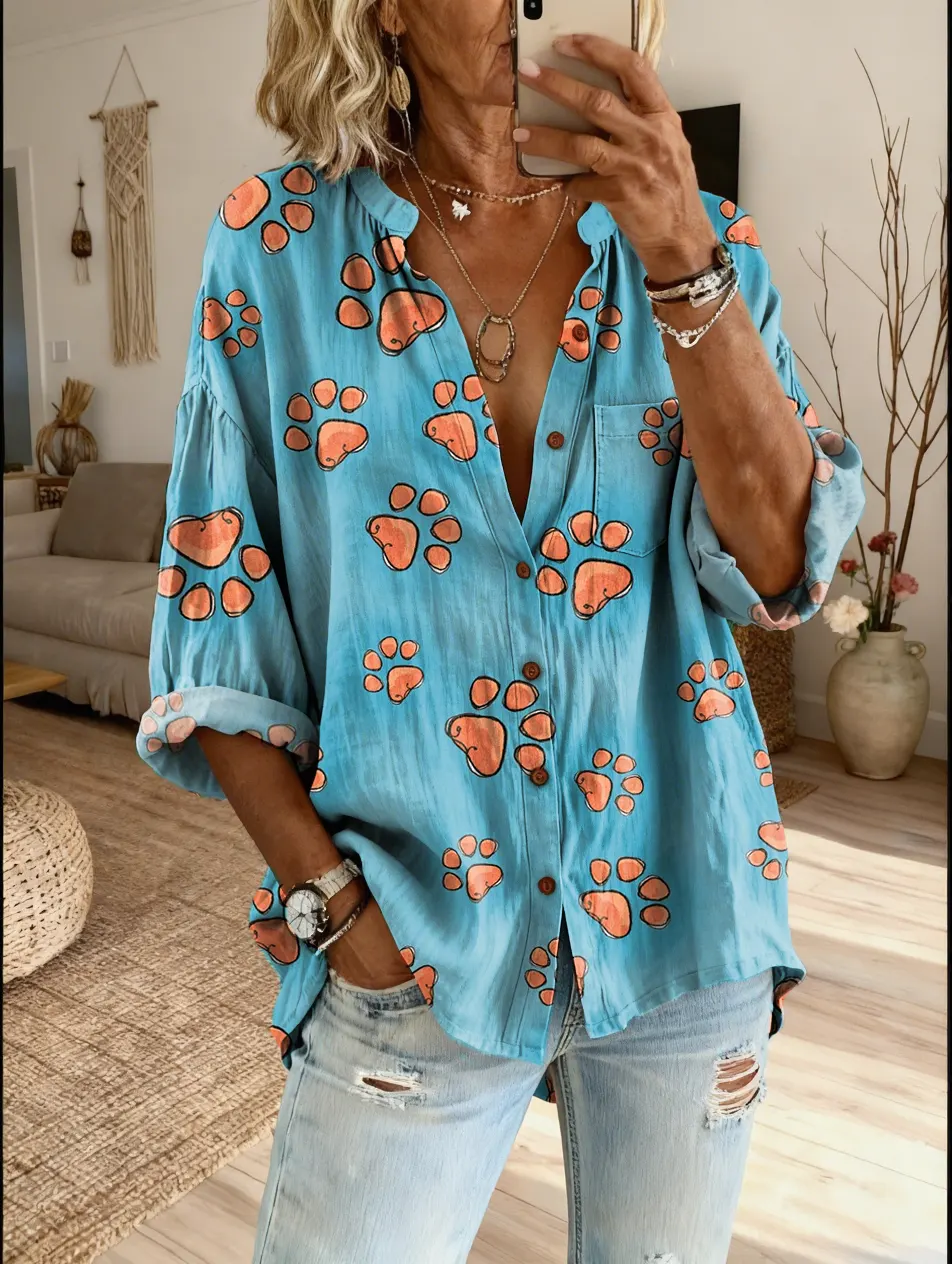 Women's Casual Cotton-Linen Blend Shirt with Artistic Dog Paw Print Design