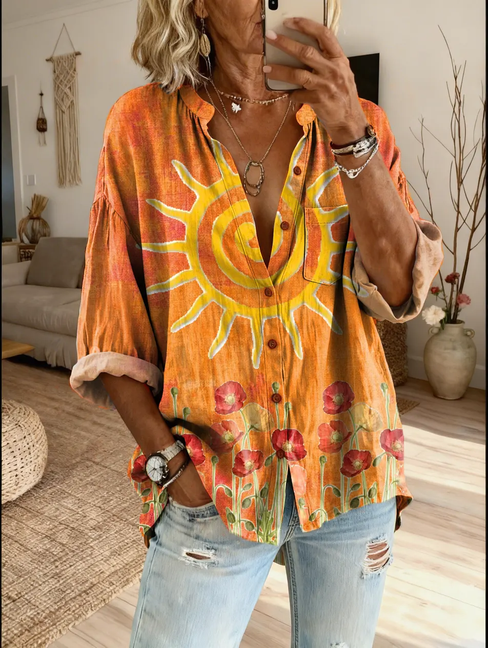 Women's Casual Cotton-linen Blend Shirt With Sunflower Floral Print