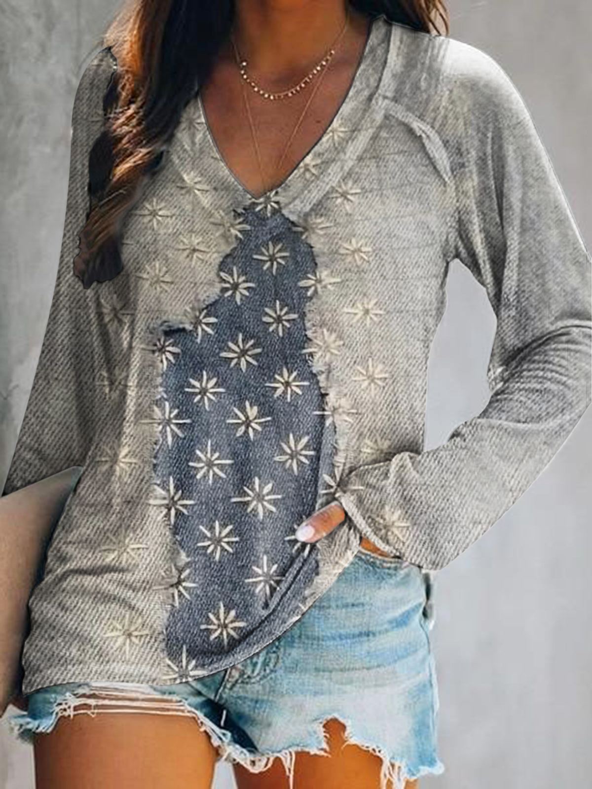 Women's Casual Vintage Floral Patchwork Art Print V Neck Long Sleeve Tops