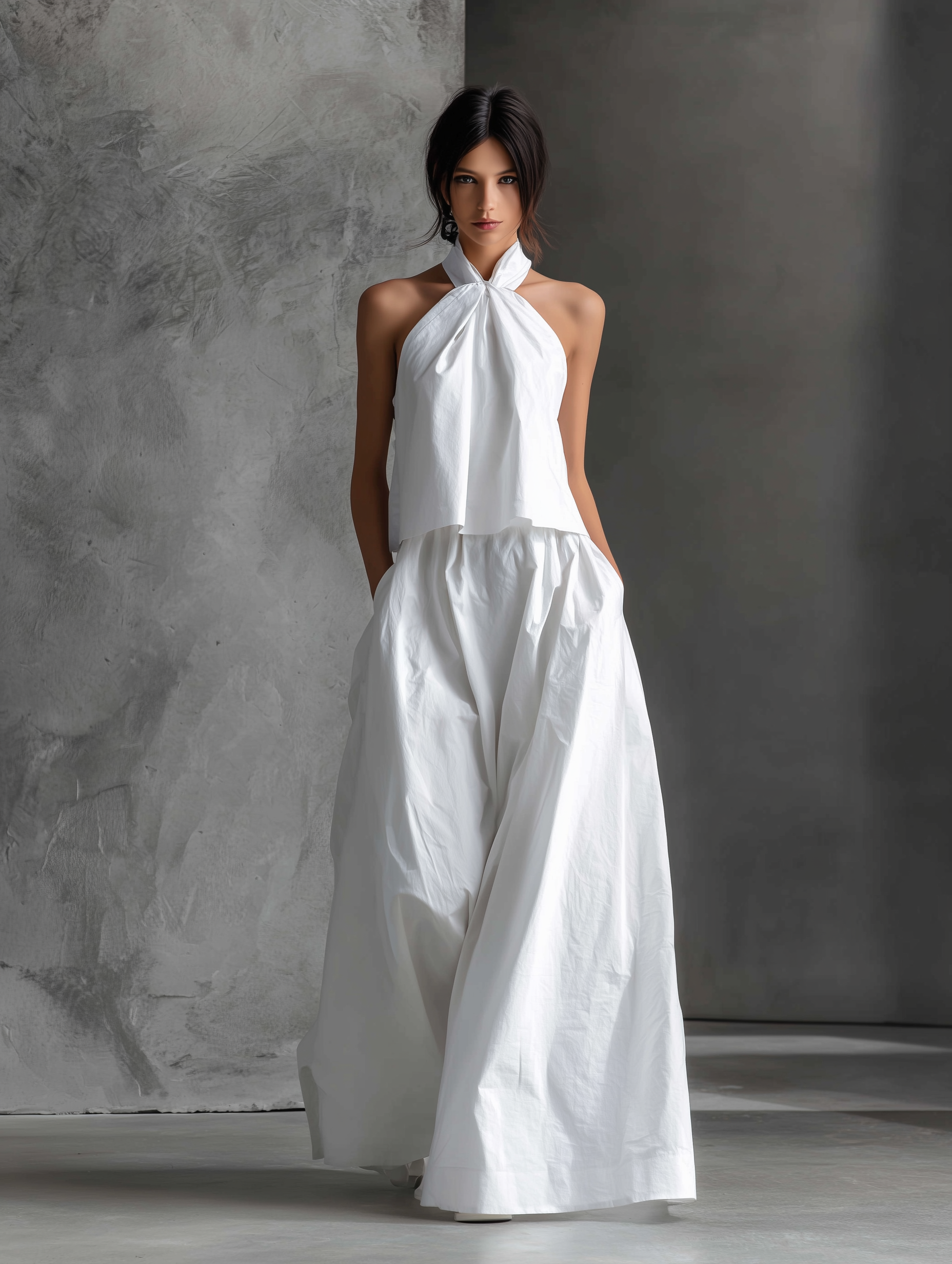 A clean and airy two-piece set made from a breathable cotton-linen blend, featuring a sleeveless halter-neck top paired with a matching skirt for a relaxed yet refined casual look.