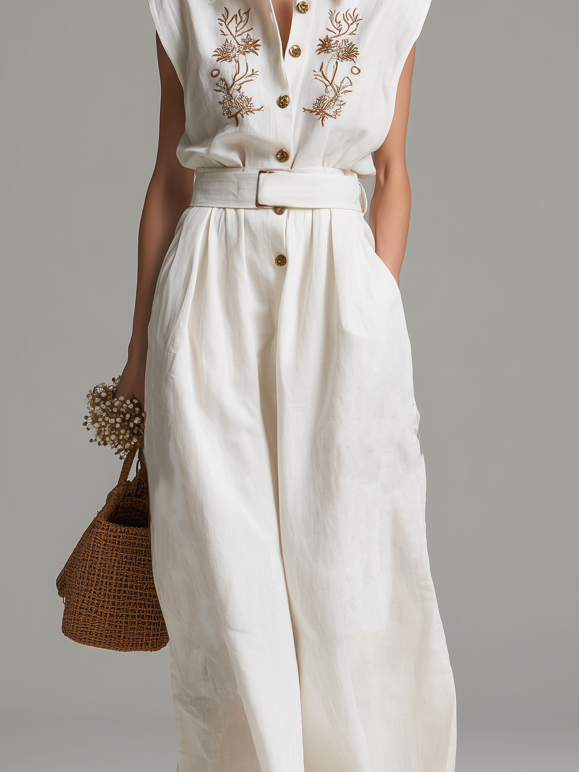Product Name: Women’s Casual White Cotton-Linen Sleeveless Jumpsuit with Embroidered Shirt Collar