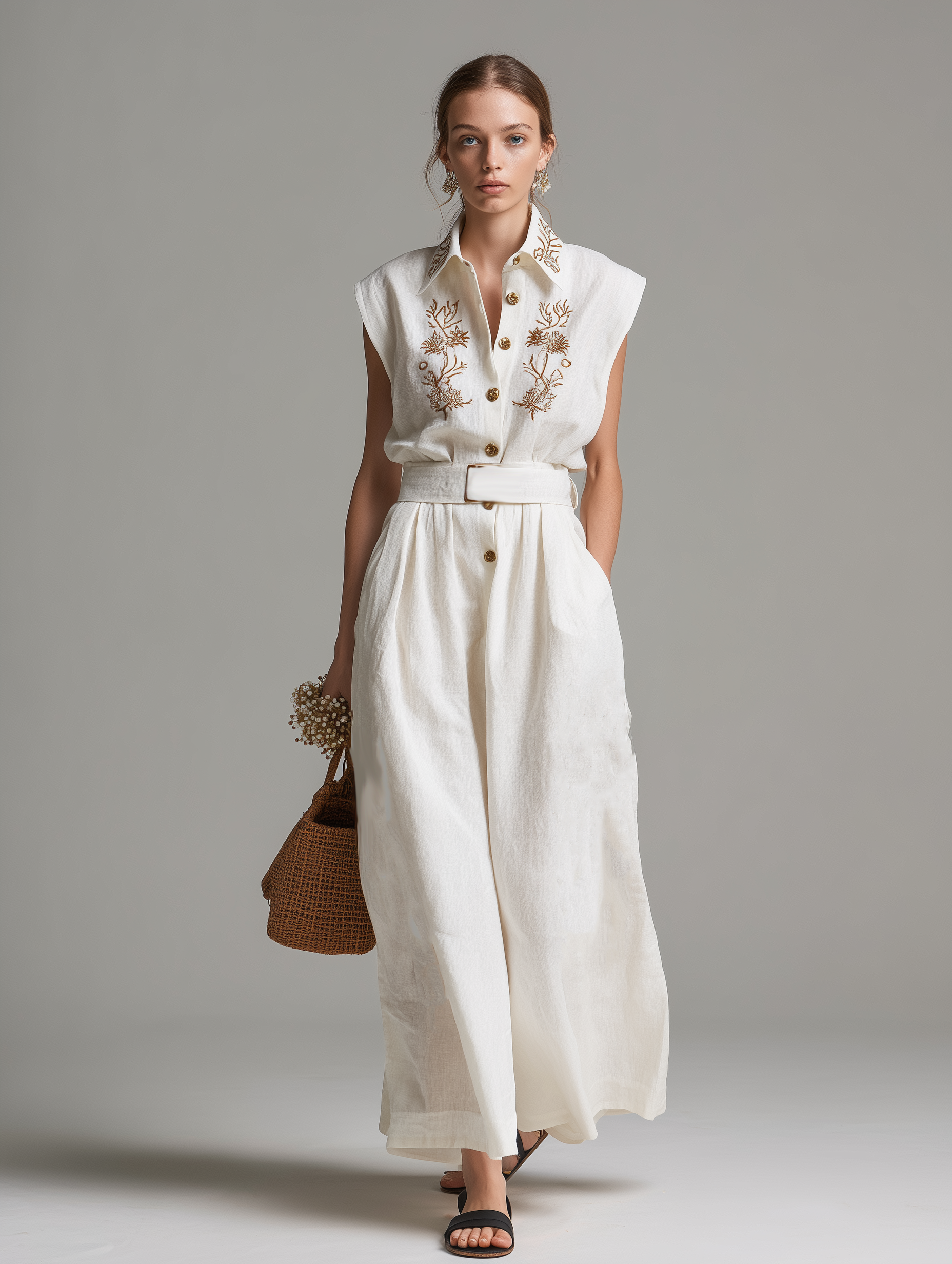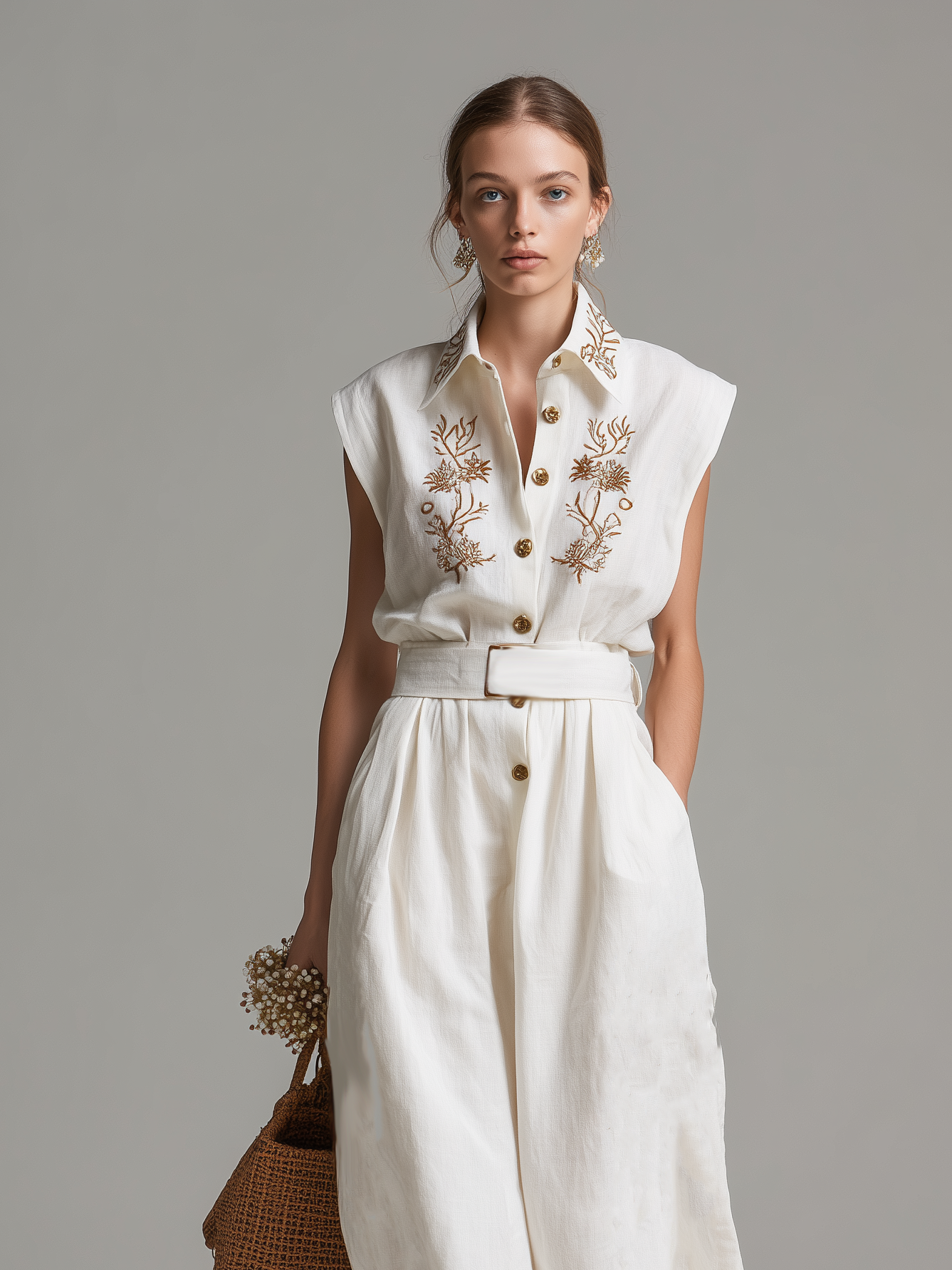 A fresh and stylish jumpsuit crafted from a breathable cotton-linen blend in a clean white tone. Featuring a classic shirt collar with delicate embroidery and a sleeveless design, the relaxed silhouette offers comfort with a touch of refined detail, perfect for effortless warm-weather styling.