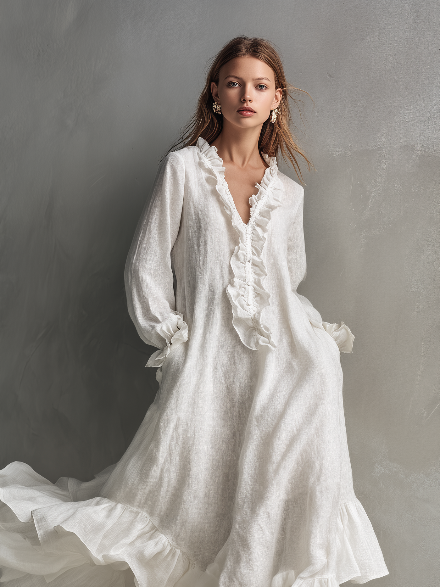 A relaxed and comfortable maxi dress crafted from a breathable cotton-linen blend. Featuring a flattering V-neckline, long sleeves, and a loose-fitting silhouette, this dress is designed with a soft lining for added comfort and coverage, making it perfect for effortless everyday wear.