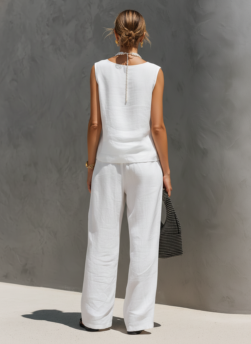 A fresh and comfortable two-piece set crafted from a breathable cotton-linen blend in a clean white tone. Featuring a V-neck sleeveless top paired with matching trousers, the lined design enhances comfort and coverage, making it perfect for effortless warm-weather styling.