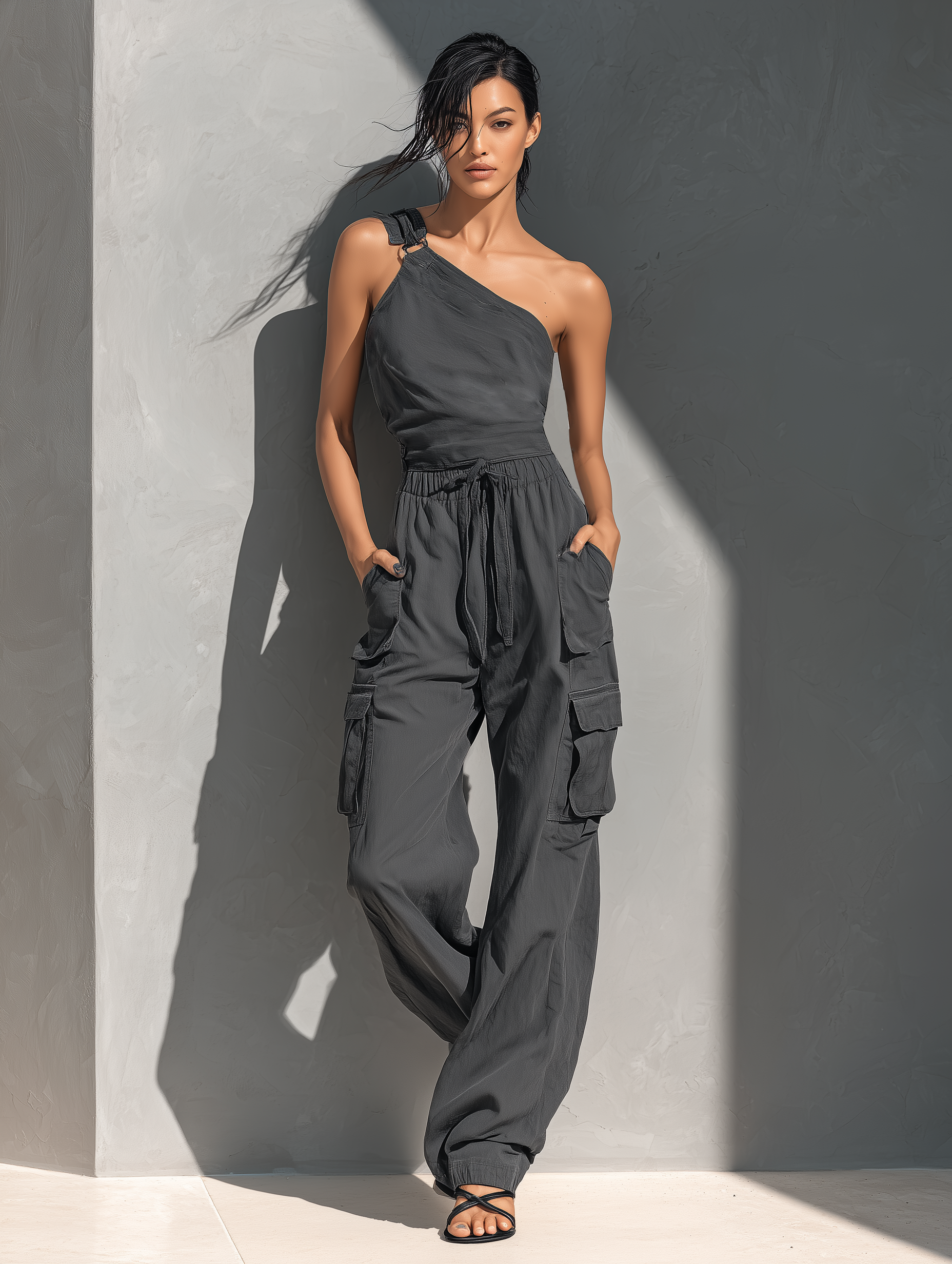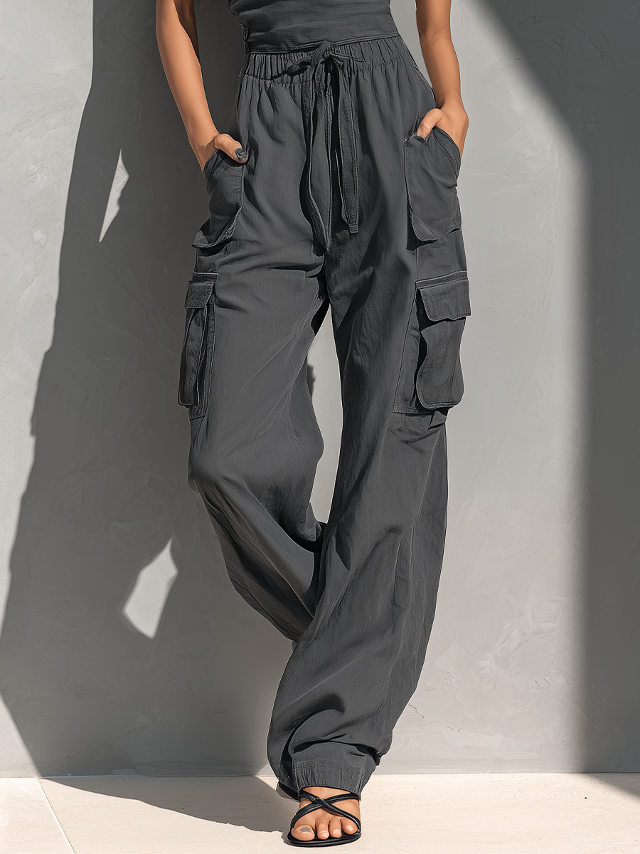This set features a one-shoulder tie-strap top and relaxed cargo pants in a charcoal grey linen-blend for an easy, stylish summer look.