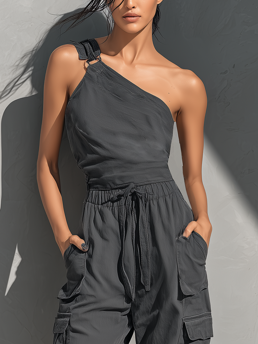 Women’s Charcoal Grey Linen-Blend One-Shoulder Tie-Strap Top And Cargo Pants Set