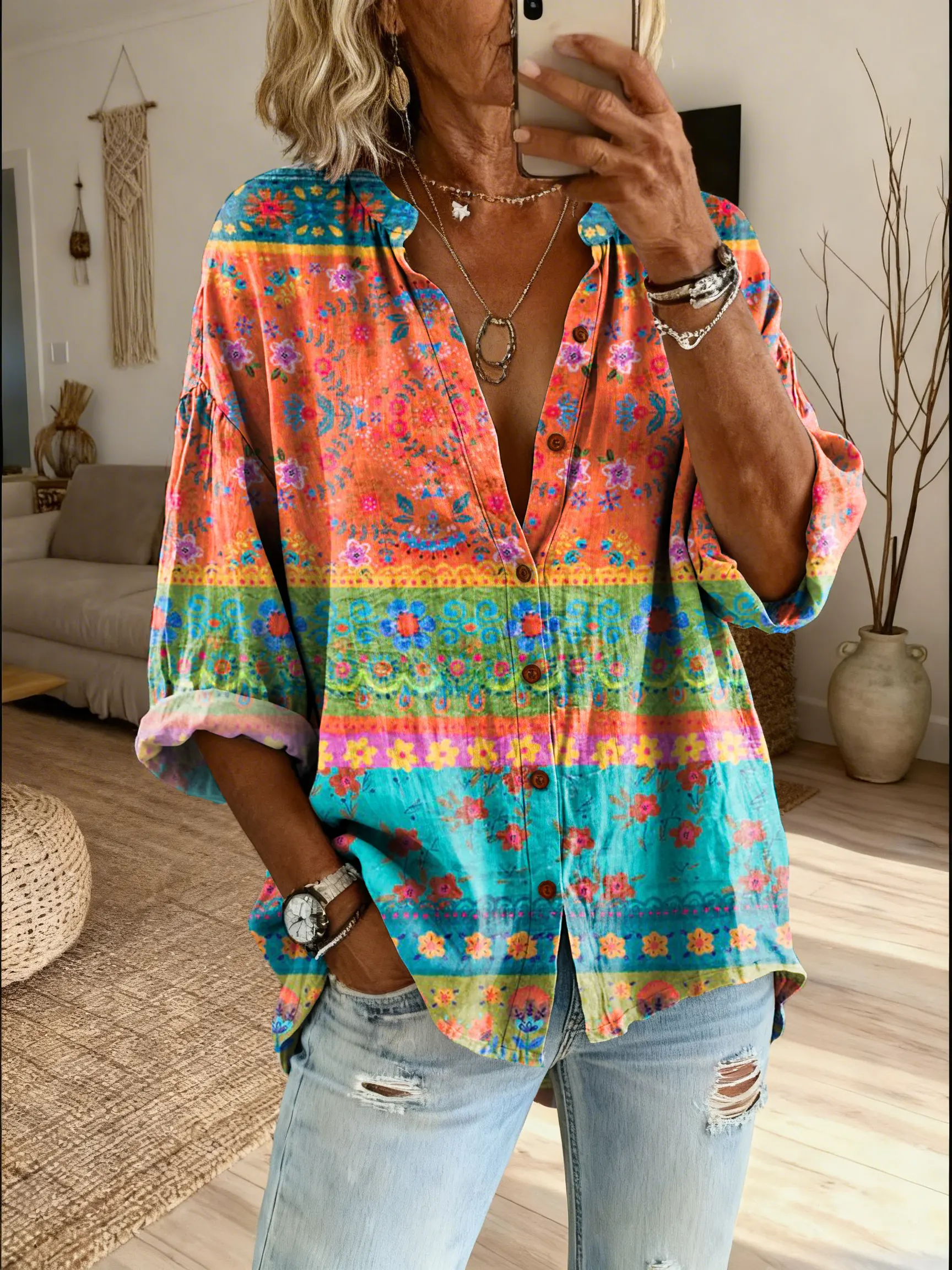 Women's Colorful Striped Retro Floral Art Print Casual Cotton Linen Shirt