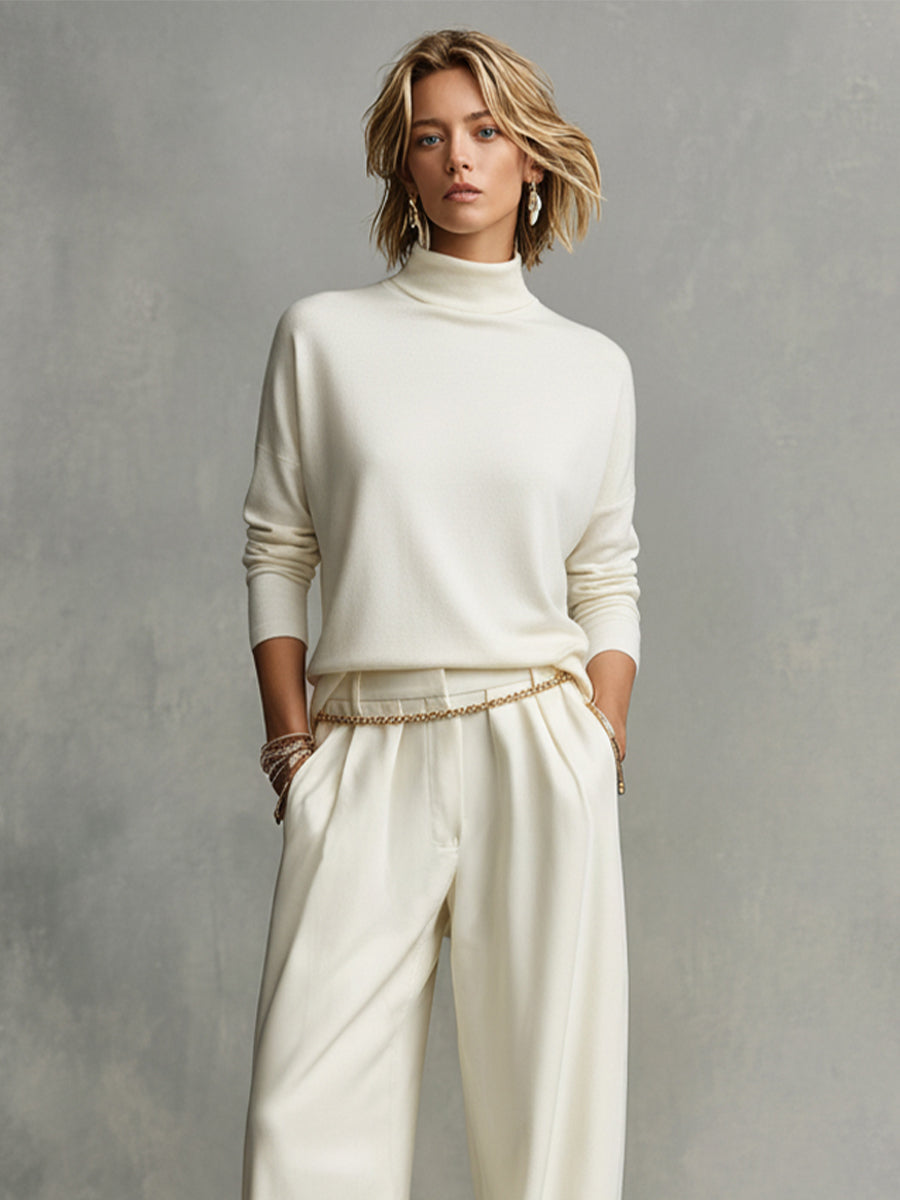 A cream knit turtleneck top paired with flowing wide-leg pants. The set offers a cozy, elegant look for casual days or relaxed evenings.
