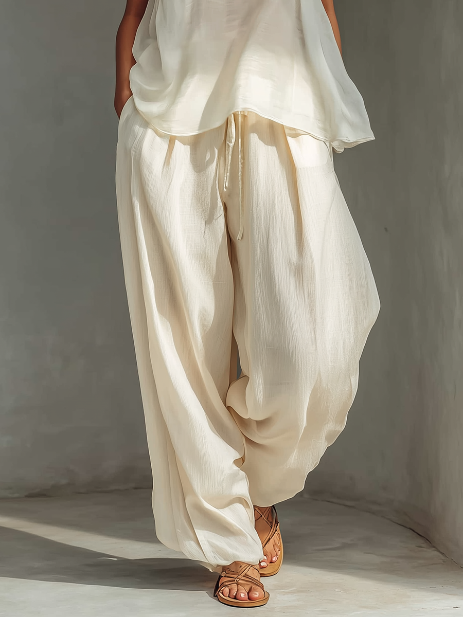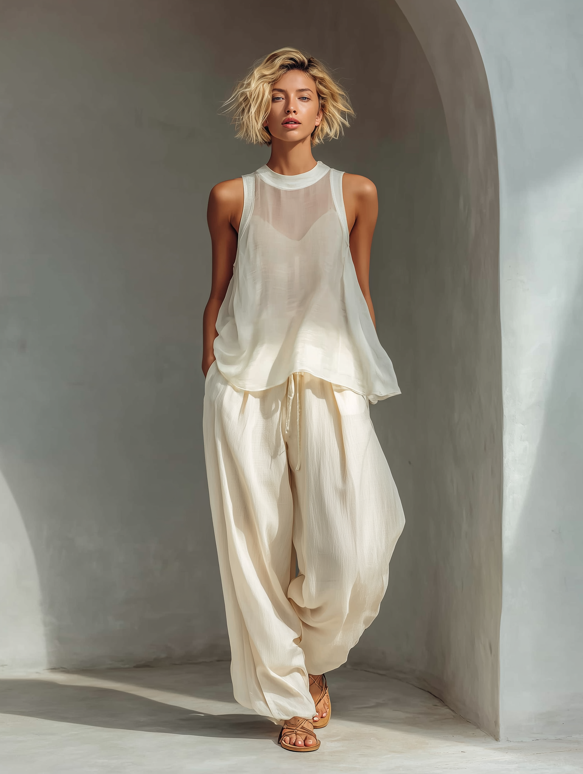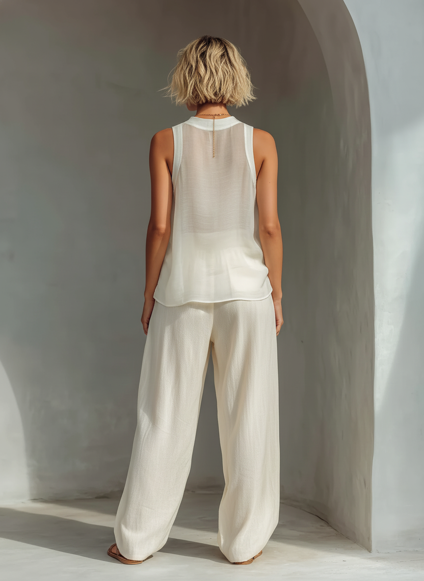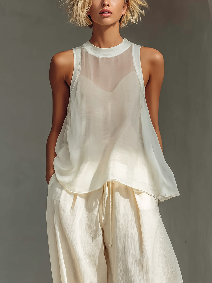 A relaxed cream two-piece set featuring a semi-sheer chiffon sleeveless top and airy drawstring wide-leg pants for a breezy, effortless vibe.