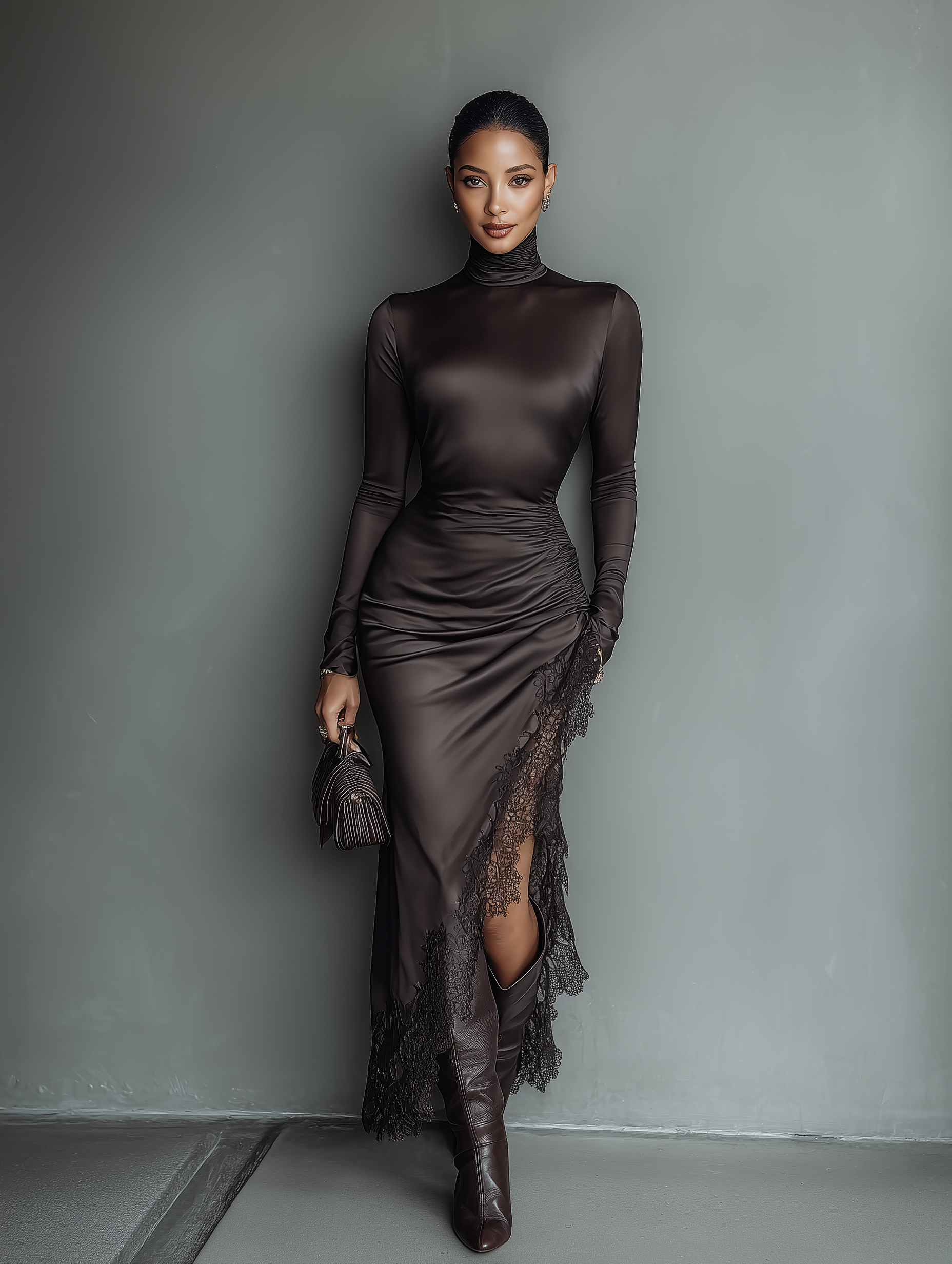 This elegant dark brown maxi dress features a figure-hugging silhouette, soft satin fabric, and delicate lace trim along a dramatic irregular hem. The high neckline and long sleeves balance its bold, sultry style.