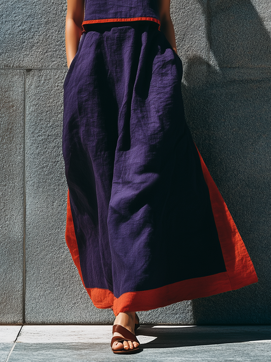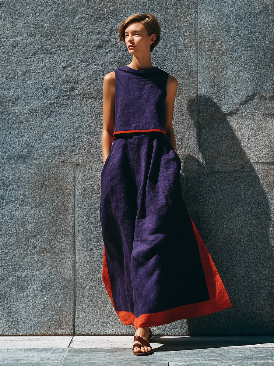 A deep purple linen-blend set with a crew-neck sleeveless top featuring contrast trim, paired with a matching flowing skirt for an easy, polished outfit.