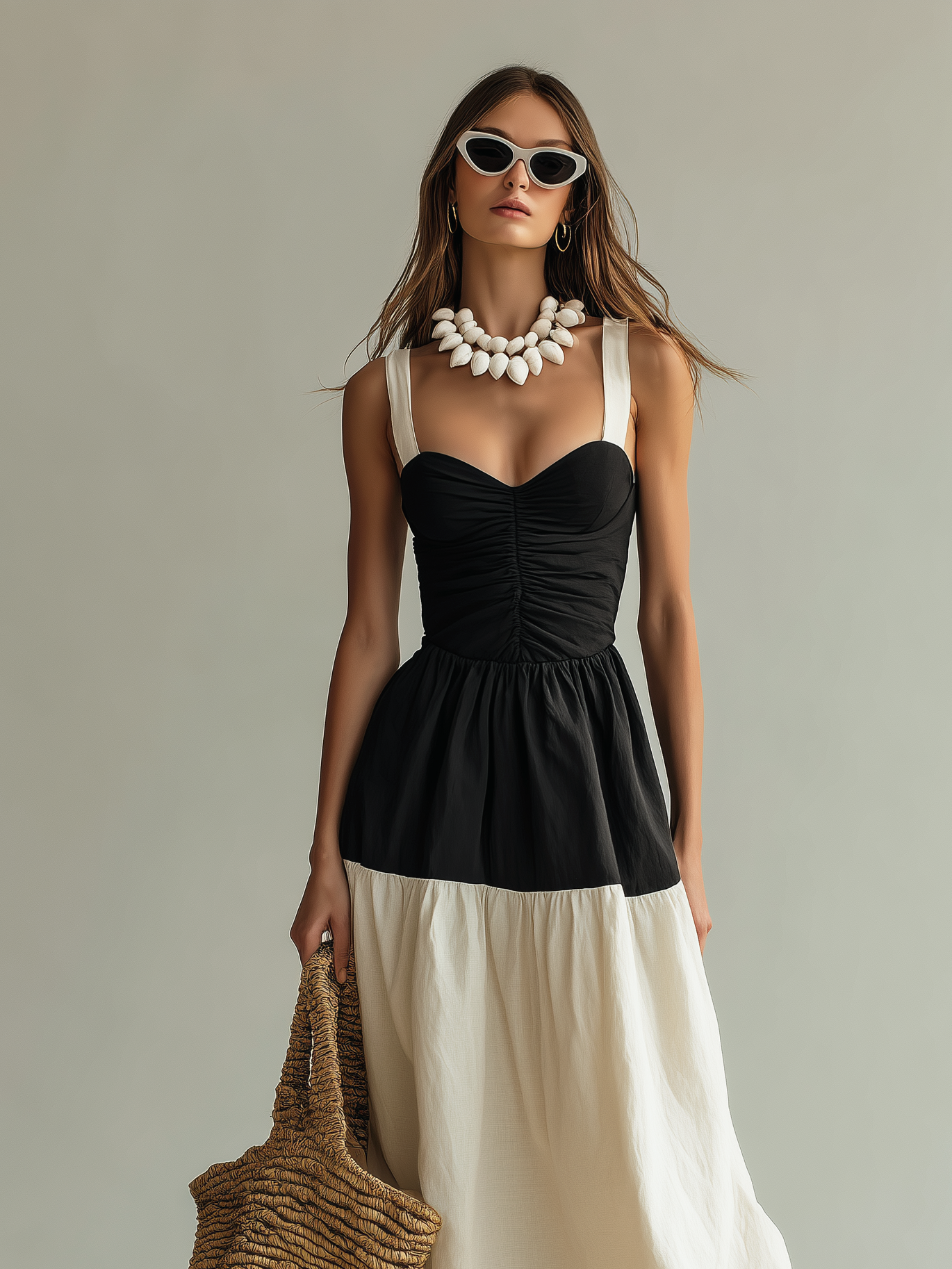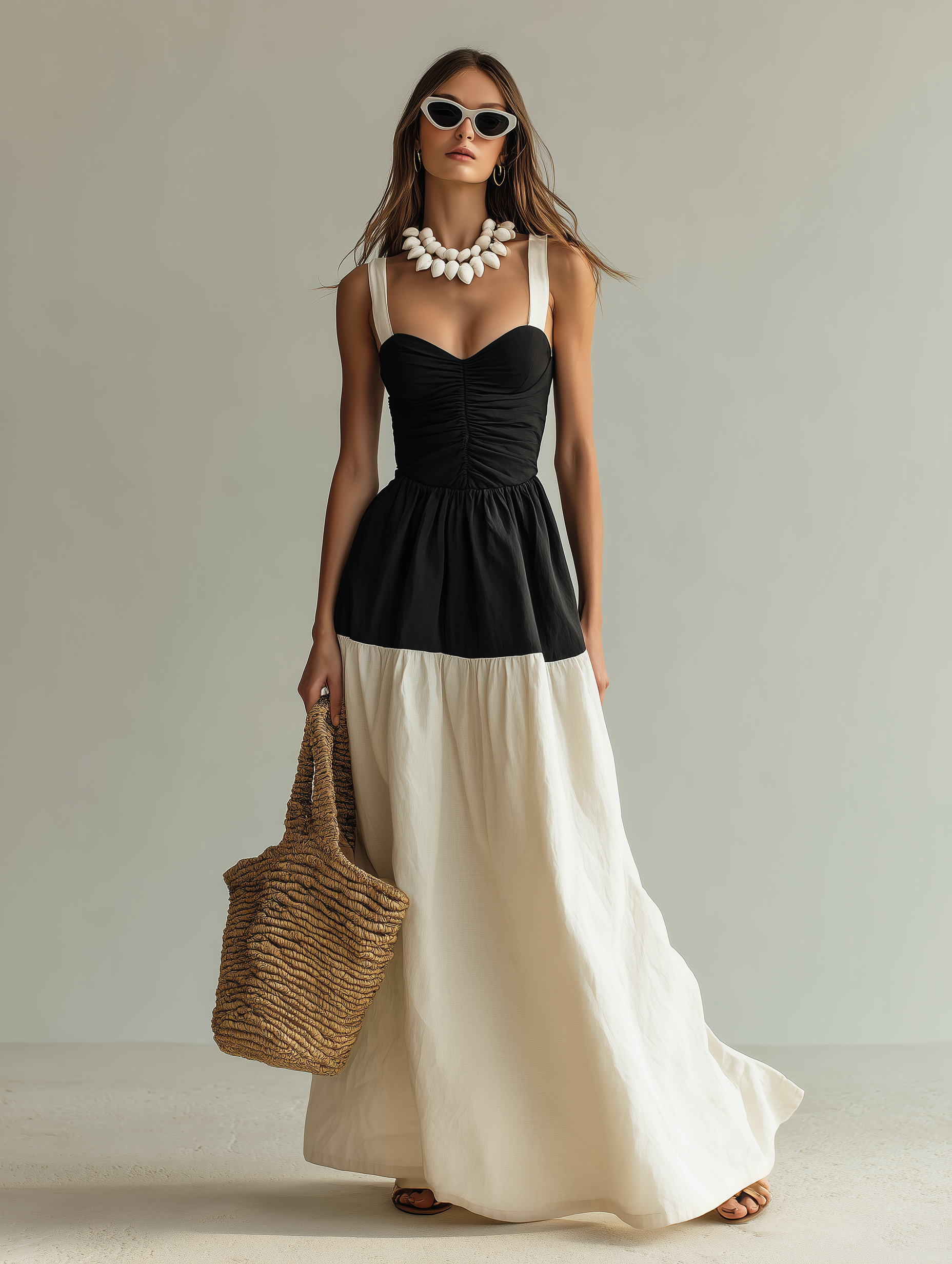 An elegant maxi dress crafted from lightweight woven fabric in a timeless black and white color combination. Featuring a modern square neckline and a sleeveless design, the flowing silhouette creates a refined and graceful look perfect for both daytime elegance and evening occasions.